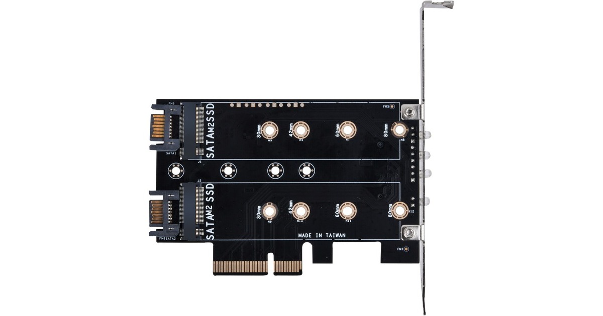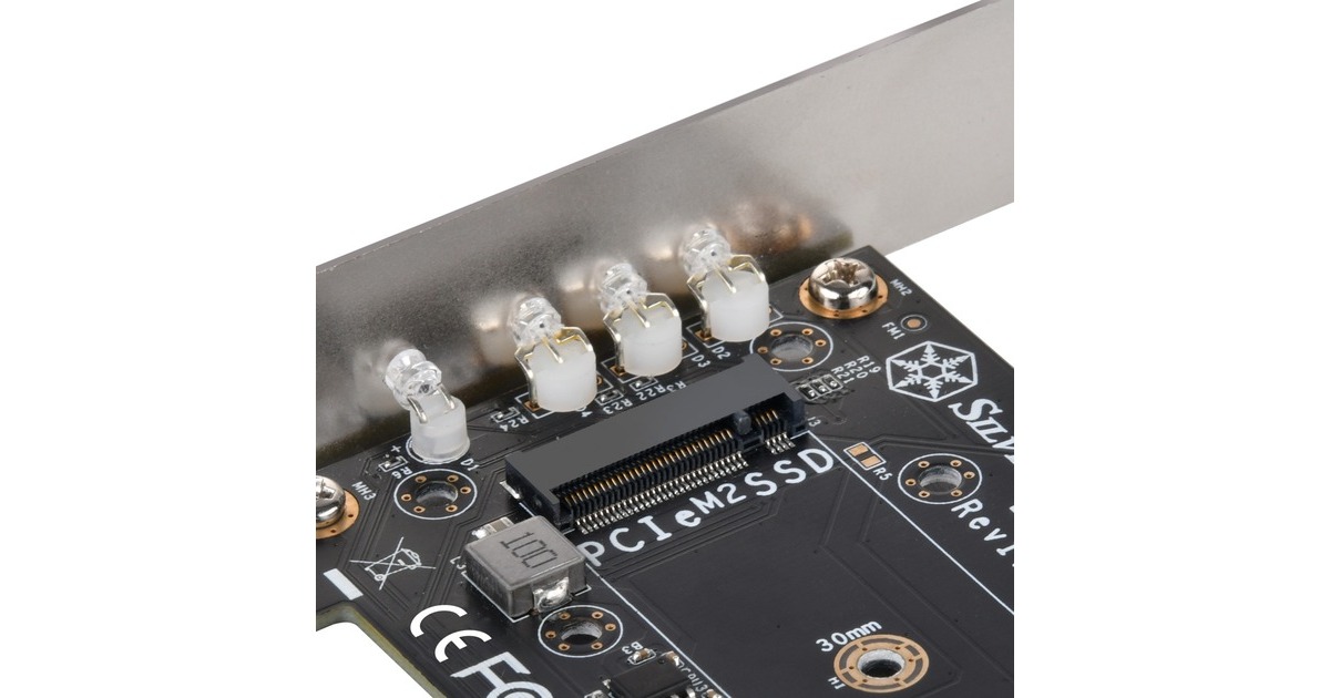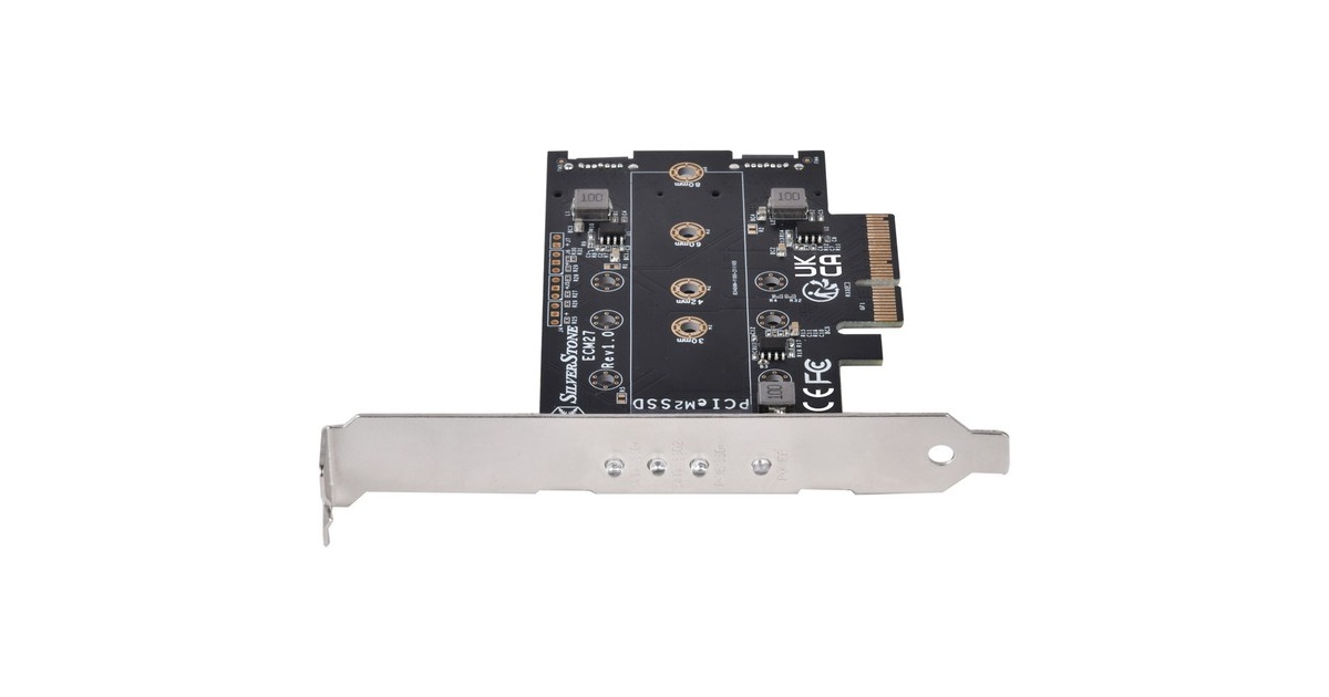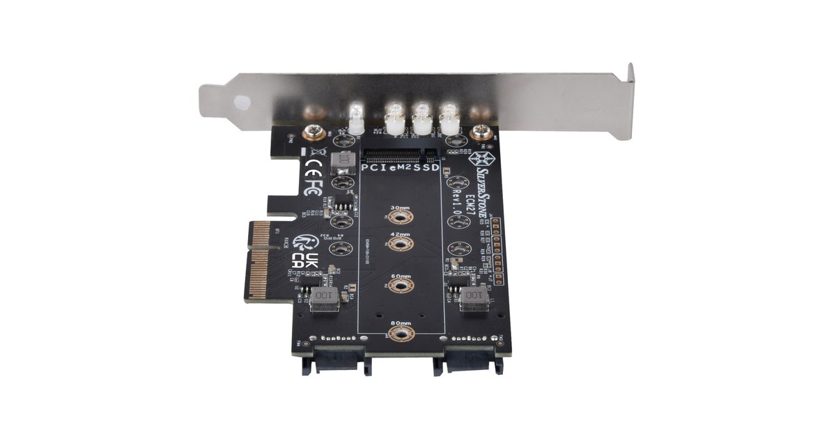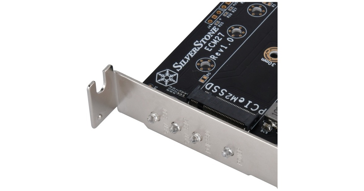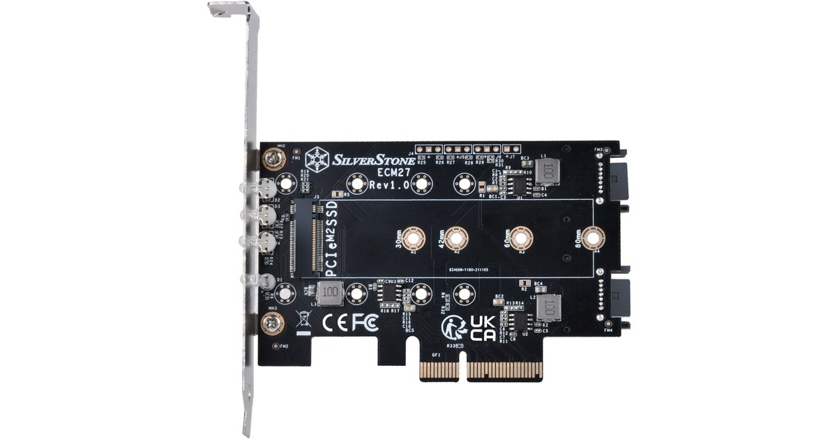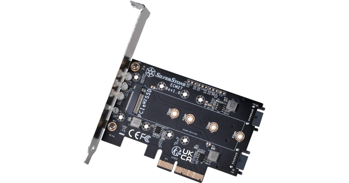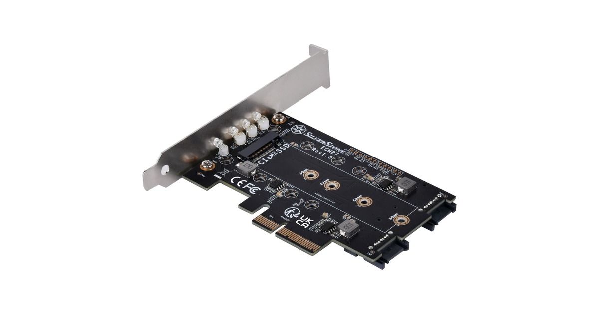 Die SilverStone ECM27 Adapterkarte verfügt über einen NVMe-Steckplatz und zwei SATA-M.2-SSD Steckplatz. Die Karte verfügt über einen PCIe-x4-Schnittstelle und unterstützt M.2-PCIe-/NVMe-SSD in der Länge 2230, 2242, 2260 und 2280. Die SilverStone ECM27 ermöglicht gleichzeitige Nutzung aller 3 M.2-SSD-Steckplätze und unterstützt 1x M.2-PCIe-SSD (M Key) mit PCIe-x4-Schnittstelle und 2x M.2-SATA-SSD (B Key).