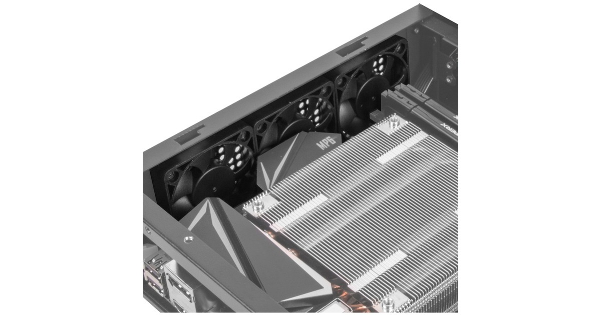 3x 5010 mm Lüfter auf der rechten Seite einbaubar, erhöhtes Top Cover: 1x 140-mm- oder 1x 120-mm-Lüfter einbaubar (Einbau M.2 möglich, Einbau SSD nicht möglich), Einstellbare / abnehmbare Gerätehalterung |