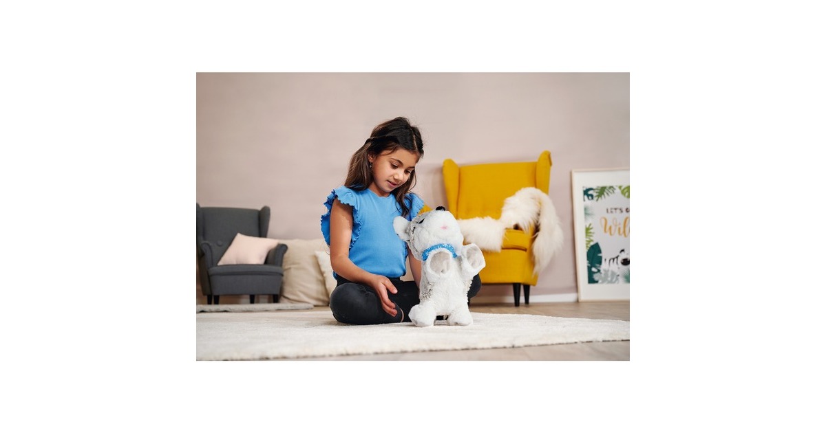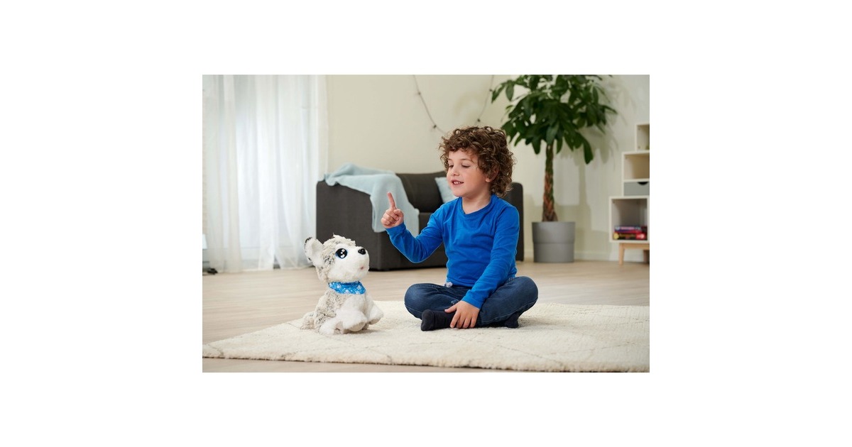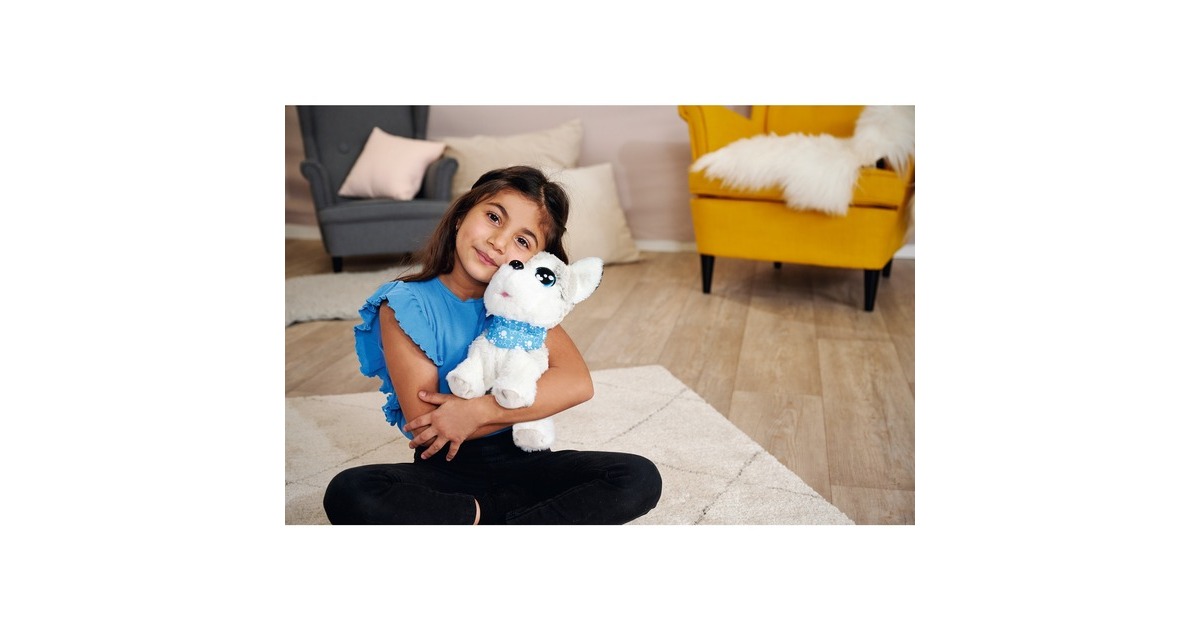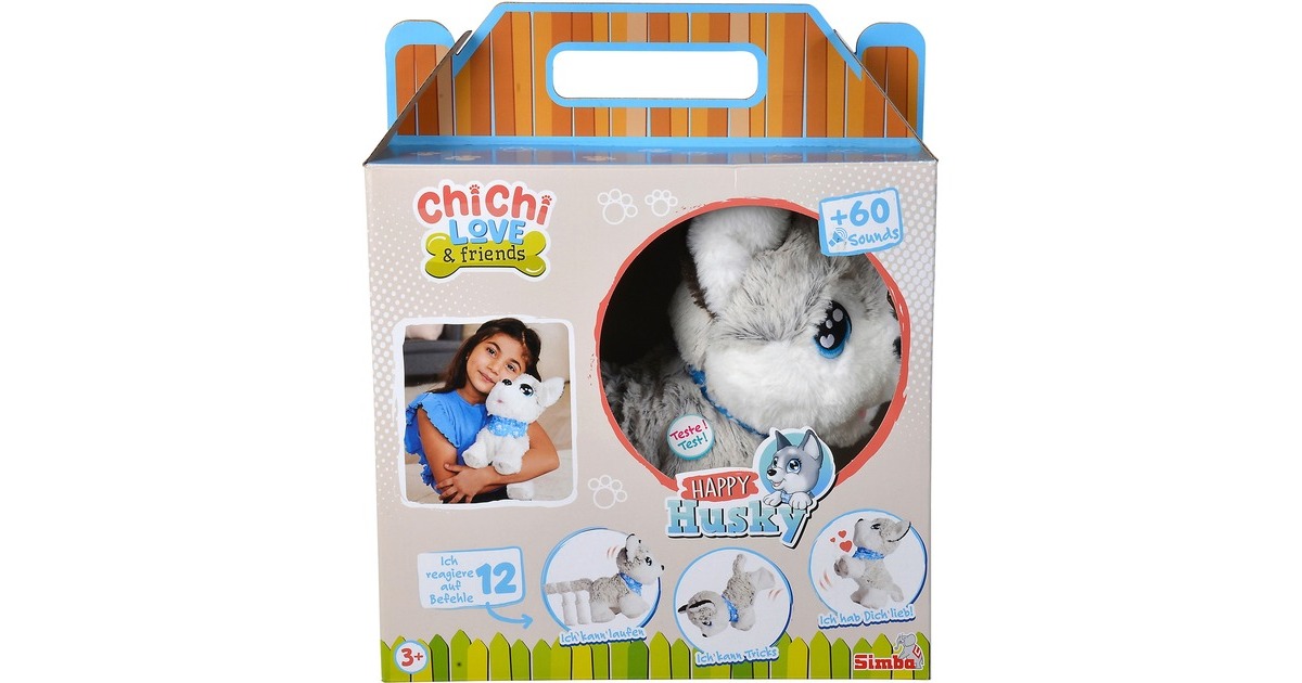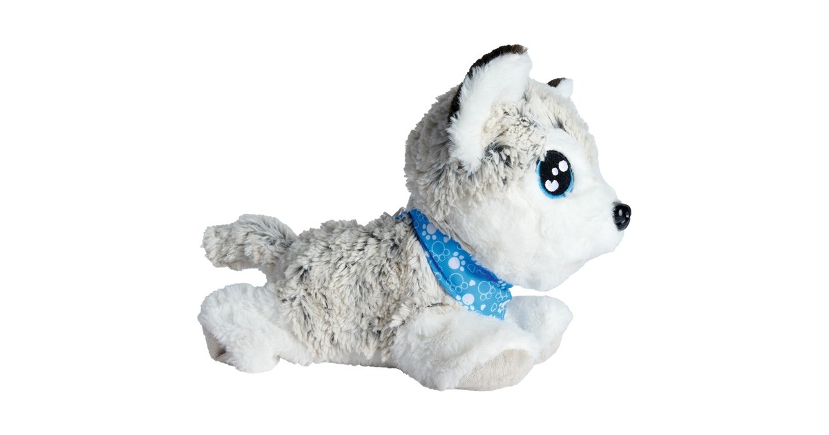 Dieser süße Husky reagiert wie ein echter Hund: Hört er ein Kommando macht er Sitz, Platz, Männchen und Kopfstand. Dieses süße Kuscheltier aus der Serie ChiChi LOVE von Simba kann außerdem singen und kennt 12 verschiedene Sprachbefehle. Die Oberfläche des Hündchens ist aus kuschelweichem Plüsch. Happy Husky ist etwa 30 Zentimeter groß und trägt ein blaues Halsband.Art.-Nr.: 1916116
