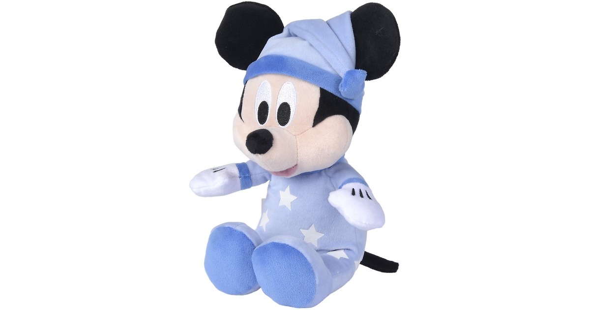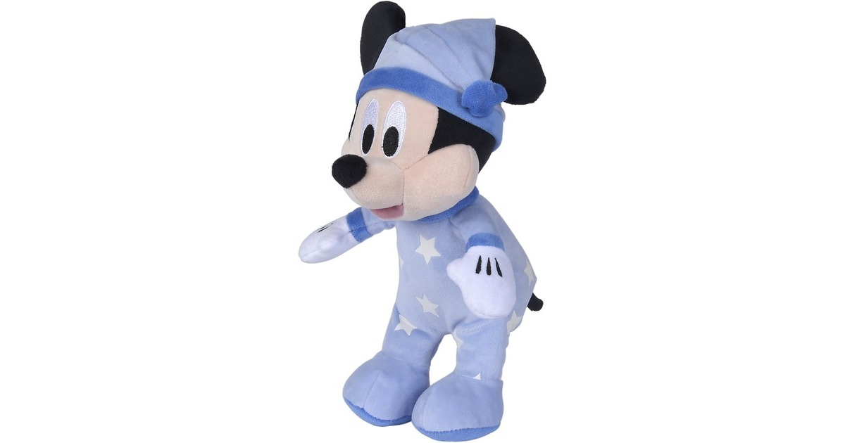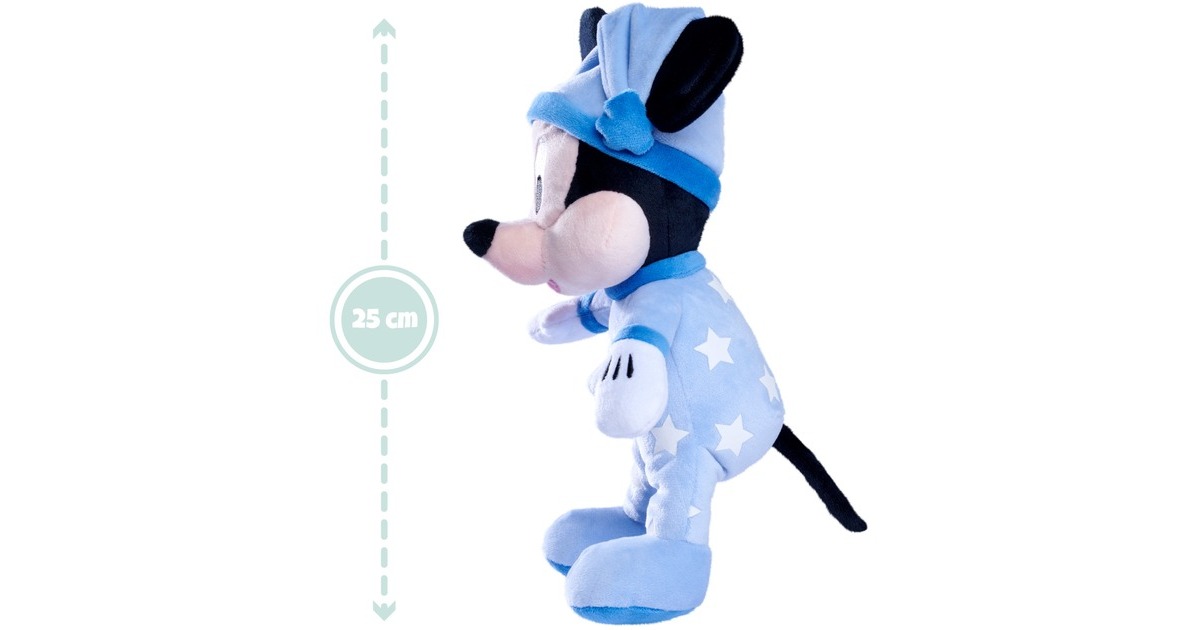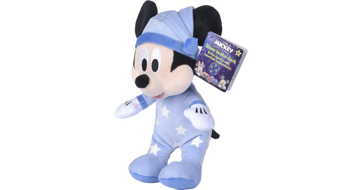 Die süße Mickey Maus Plüschfigur trägt einen blauen Pyjama mit Sternen und Schlafmütze und freut sich auf Kuschelstunden mit den Kids. Die vielen Sterne auf dem Strampler können Licht speichern und leuchten deshalb im Dunkeln noch für einige Zeit nach. Mickey besteht aus superweichem und flauschigem Plüschmaterial. Damit ist die Plüschfigur perfekt zum Kuscheln und Schmusen geeignet und ein begleitet die Kinder auch beim Einschlafen. Der 25 cm große Gute Nacht Mickey ist ein kuscheliger Freund für Kinder und als erstes Spielzeug das ideale Geschenk für Neugeborene.Art.-Nr.: 1825906