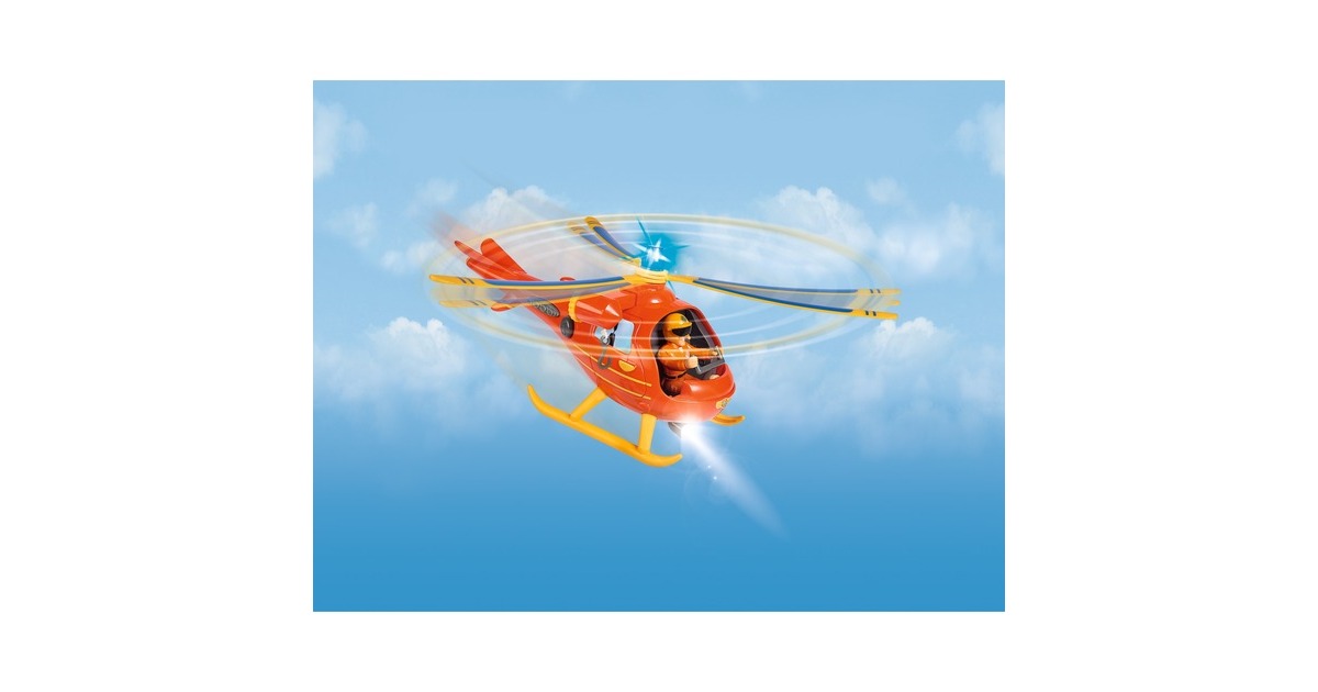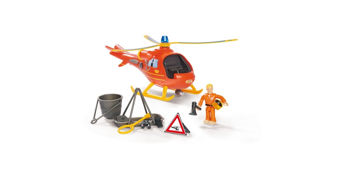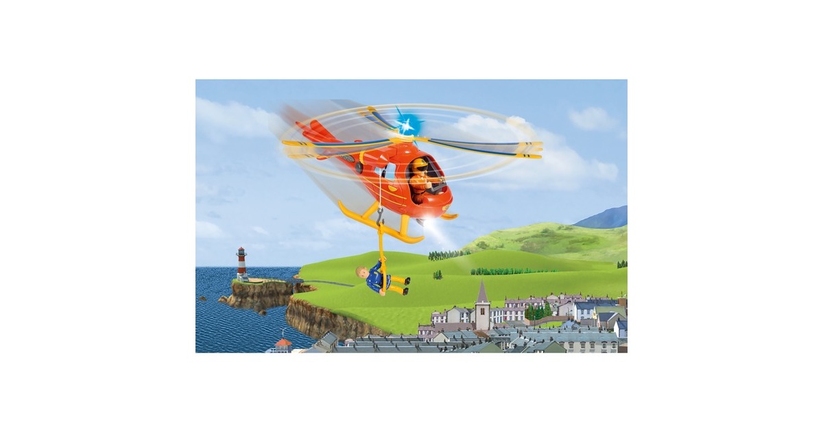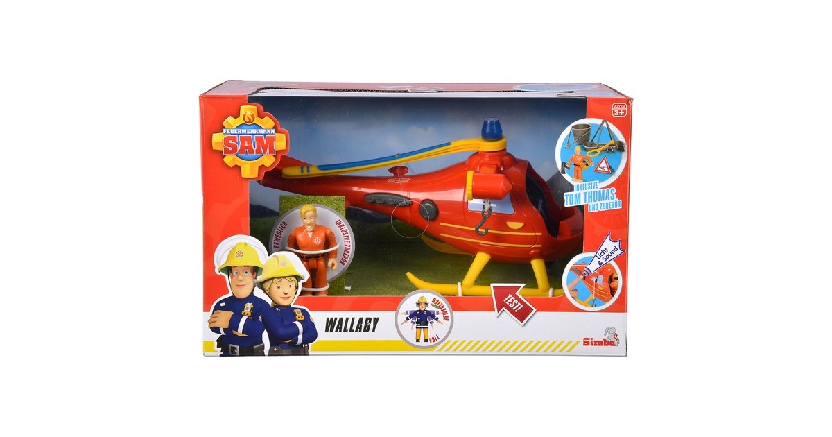 Hubschrauber Wallaby ist eines der Einsatzfahrzeuge von Feuerwehrmann Sam und seinen Kollegen aus Pontypandy. Hinter dem Steuer hat Tom Thomas Platz genommen. Mit dem 15 cm großen Hubschrauber werden Unfallpersonen mit der Trage schnell ins nächste Krankenhaus geflogen oder Feuer mit dem Bottich aus der Luft gelöscht; Trage oder Bottich werden an der Seilwinde befestigt. Am Heck des Hubschraubers kann mit Tastendruck das Blaulicht aktiviert werden; dabei ertönt ein cooler Originalsound. Damit Pilot Tom auch in der Dunkelheit auf Rettungsmission gehen kann, ist Wallaby mit einem Suchscheinwerfer ausgestattet; eine Seilwinde und viel Zubehör vervollständigen die Ausstattung des Hubschraubers.Art.-Nr.: 1788534