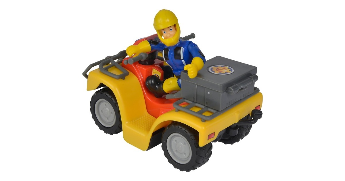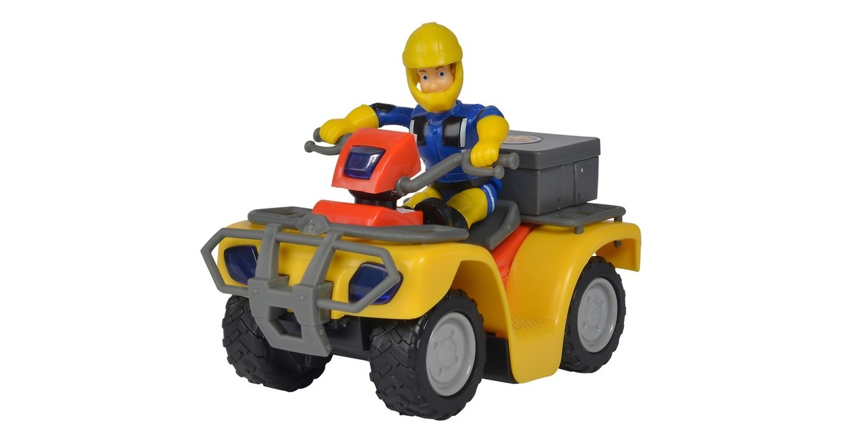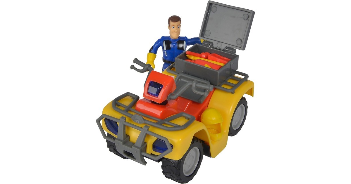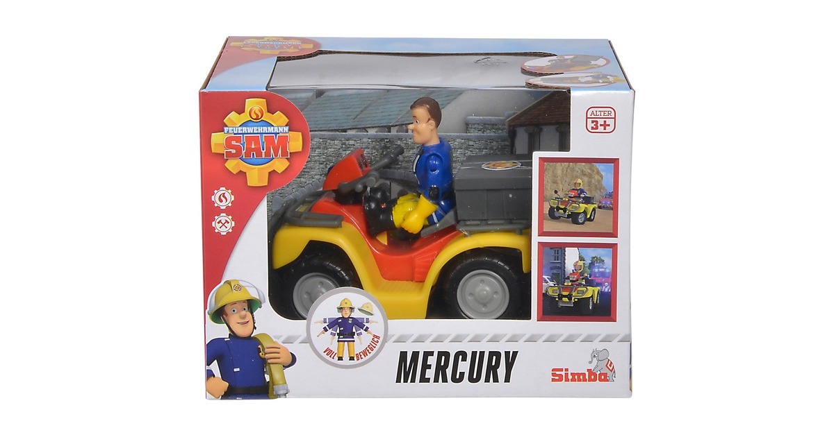 Das Mercury-Quad ist eines der Einsatzfahrzeuge von Feuerwehrmann Sam und seinem Team aus Pontypandy. In der Box auf dem Gepäckträger hat Sam einen Feuerlöscher, Verbandskasten, Axt und vieles mehr für den Einsatz dabei.Art.-Nr.: 1237057