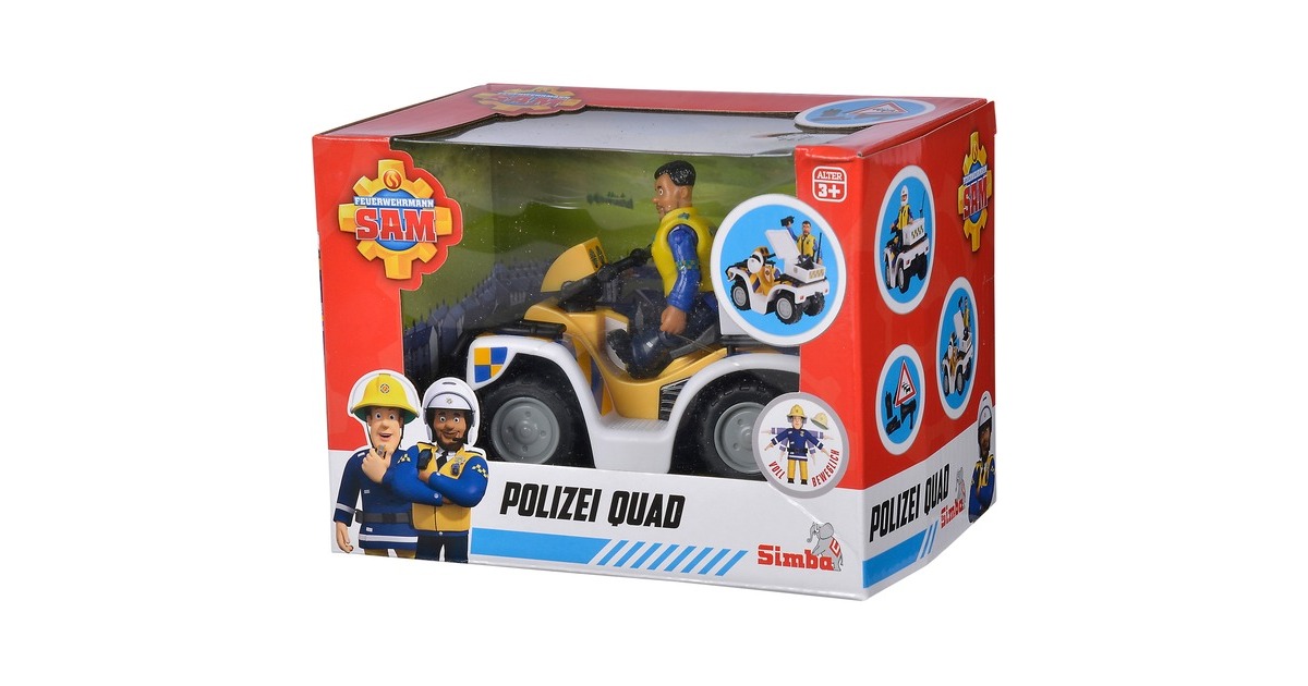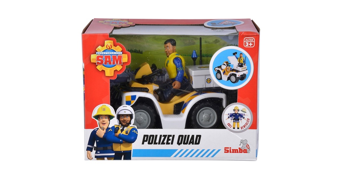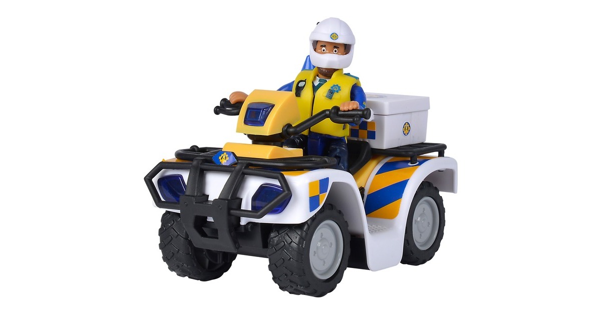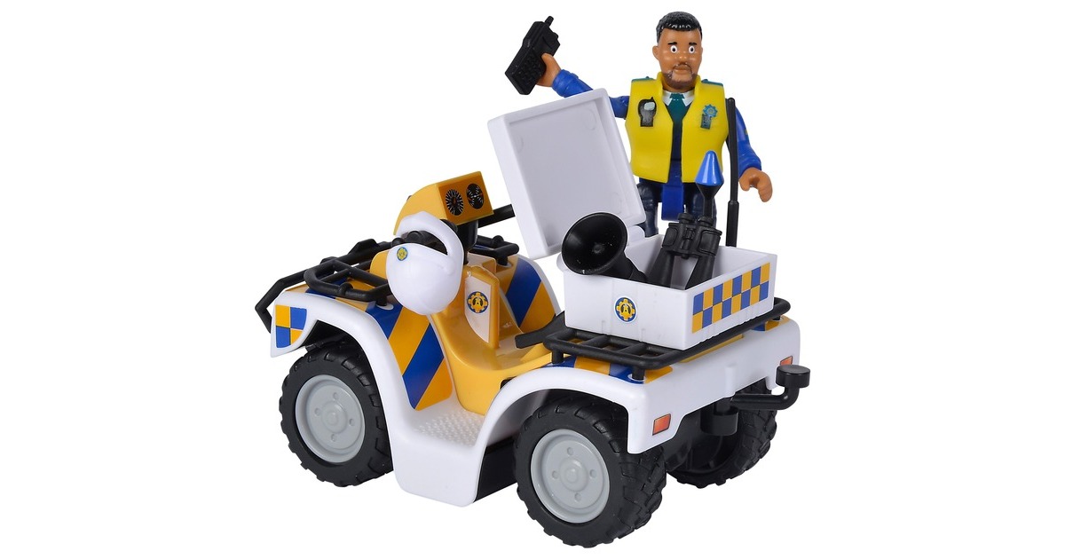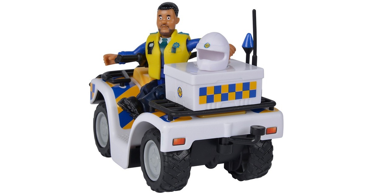 Polizist Malcolm ist aus der Kinderserie Feuerwehrmann Sam bekannt und dort das erste Mal in Staffel 12 zu sehen. In der Serie ist Polizist Malcolm unter anderem mit seinem Quad unterwegs. Dieses ist dem Original aus der Serie nachempfunden und in weiß-gelb-blau gehalten. Im Set ist neben dem Polizeiquad auch eine bewegliche Polizist Malcolm Figur enthalten, auf dem Quad Platz nehmen kann. Weiteres Verkehrszubehör rundet das Set ab. So kann man sofort mit Malcolm auf Streife gehen.Art.-Nr.: 1651758