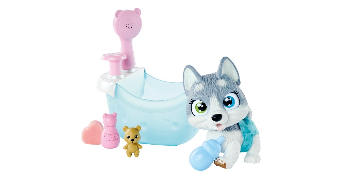 Die süßen Tierbabys aus der Serie Pamper Petz suchen einen Besitzer, der sich um die kümmert. Der in diesem Set enthaltene Husky ist neben Hase und Katze ein Mitglied der Windelbande, die jeweils über eine Trink- und Nässfunktion verfügen. Der Husky kann richtig aus dem Fläschchen trinken und danach in die Windel machen. Die Windel verfärbt sich gelb, wenn sie nass wird. In der 25 Zentimeter großen Badewanne gibt es für den kleinen Husky jede Mange Badespaß: Mit der Handbrause mit Pumpfunktion kann er abgeduscht werden. Mit dabei ist eine kleine Schaumflasche zum Befüllen mit Badezusatz.Art.-Nr.: 1788529