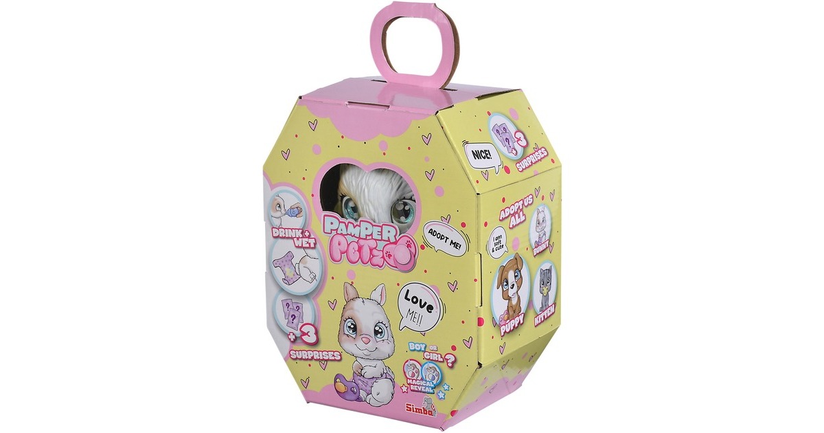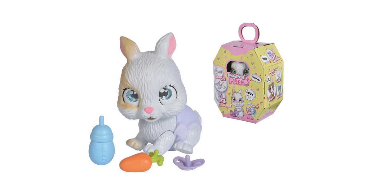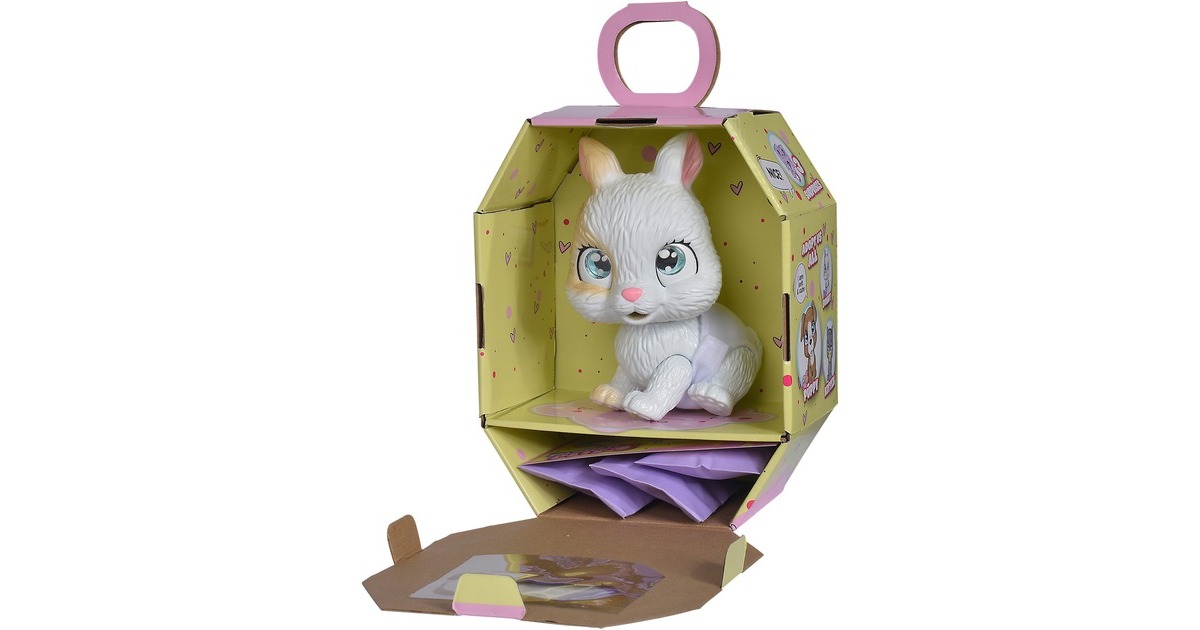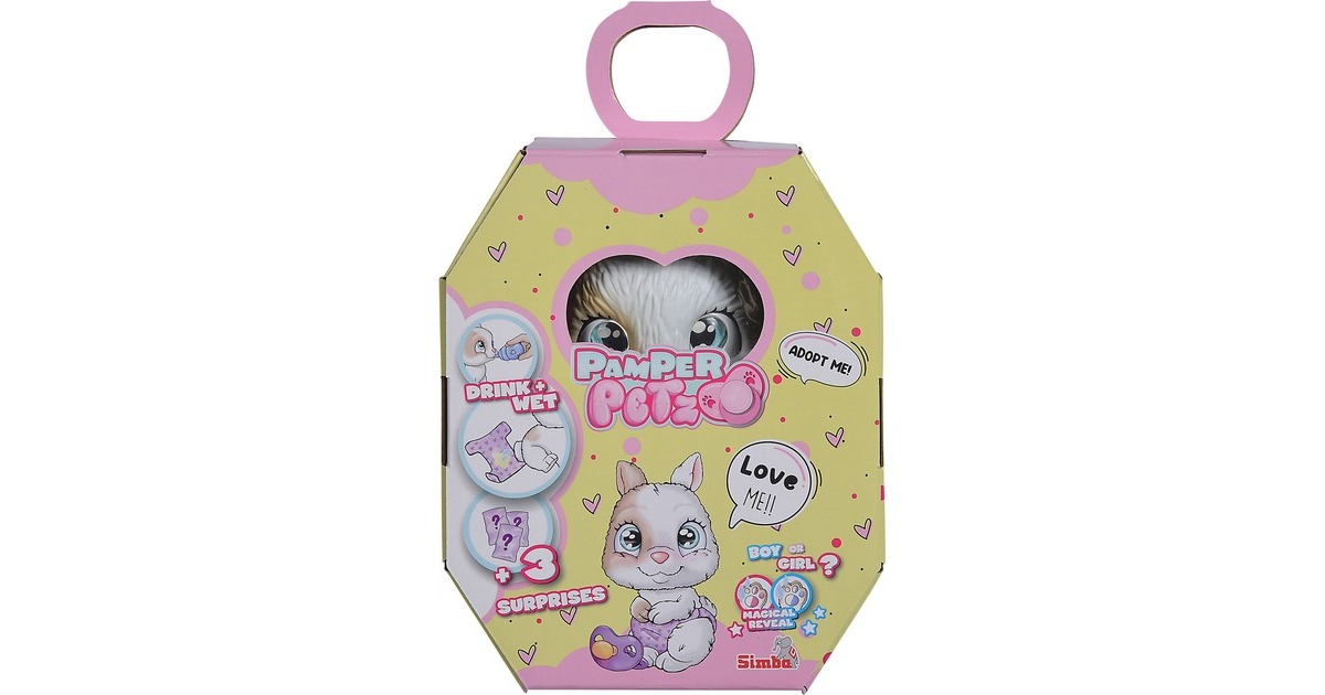 Die süßen Tierbabys aus der Serie Pamper Petz suchen einen Besitzer, der sich um die kümmert. Der in diesem Set enthaltene Hase ist neben Husky und Katze ein Mitglied der Windelbande, die jeweils über eine Trink- und Nässfunktion verfügen. Der Hase mit den glitzernden Augen kann richtig aus dem Fläschchen trinken und danach in die Windel machen. Die Windel verfärbt sich gelb, wenn sie nass wird. Mit der magischen Pfote lässt sich das Geschlecht des Hasens bestimmen: Wird darüber gewischt, verfärbt sie sich entweder blau oder pink. Mit in diesem Set sind außerdem drei Überraschungen zum Pflegen und Füttern sowie eine Adoptionsurkunde zum selbst Beschriften enthalten.Art.-Nr.: 1623602