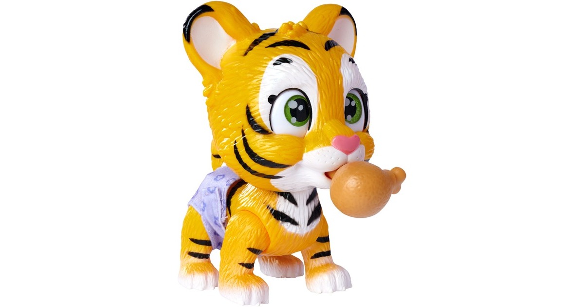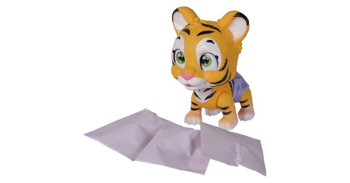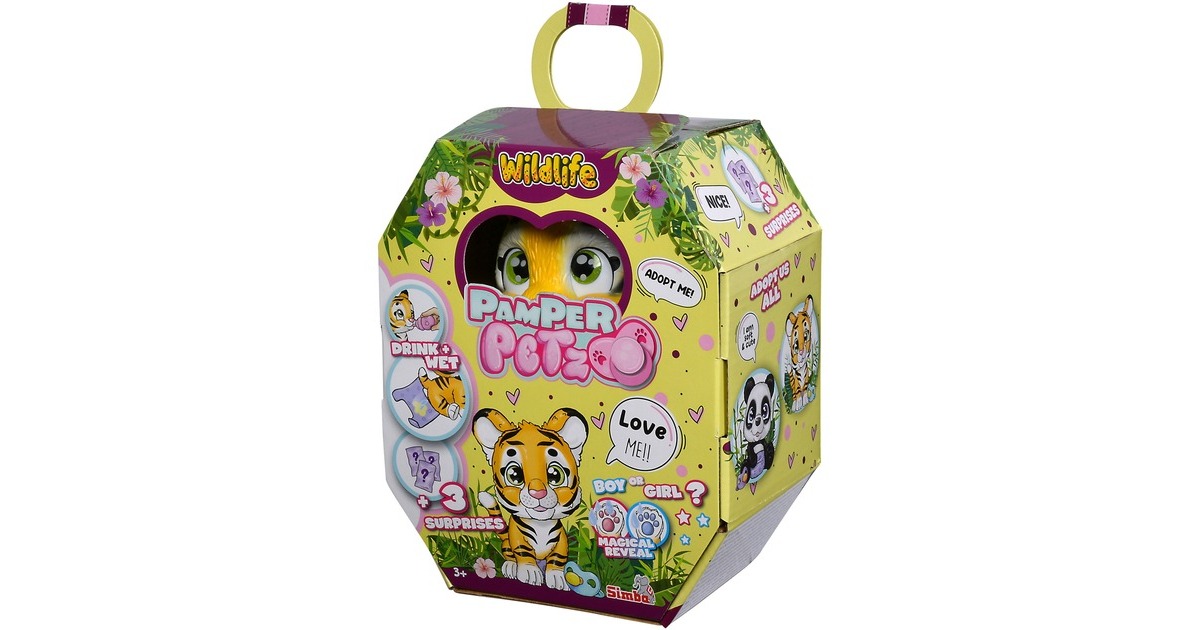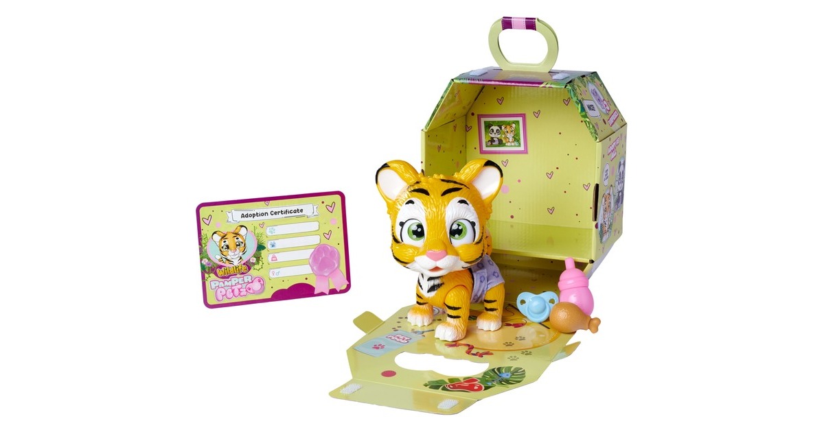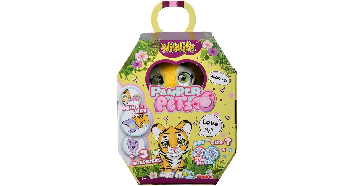 Pamper Petz - die süßen Pamper Petz Tierbabys suchen einen Besitzer, der sie adoptiert, ihnen einen Namen gibt und sich liebevoll um sie kümmert. Die süße Windelbande besteht aus einem Hündchen, einem Kätzchen und einem Häschen, die alle eine Windel tragen. Mit Trink- und Nässfunktion - das süße Katzenbaby mit den großen glitzernden Augen kann richtig trinken. Ab und zu macht es auch einmal in die Windel. Dazu klappt man einfach die Hinterbeine nach vorne und setzt das Kätzchen hin. Ist die Windel nass, verfärbt sich das Innere Gelb. Magische Pfote - ob es sich bei dem eigenen Haustier um einen Jungen oder ein Mädchen handelt, verrät die magische Pfote. Wischt man mit Wasser darüber, so verfärbt sich diese entweder Blau oder Pink und gibt somit Aufschluss über das Geschlecht. Mit drei Überraschungen - im Set sind neben dem 15cm großen Tigerbaby drei Überraschungen zum Pflegen und Füttern des Kätzchens sowie eine Adoptionsurkunde zum Beschriften enthalten.