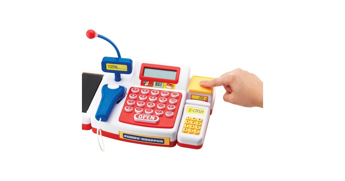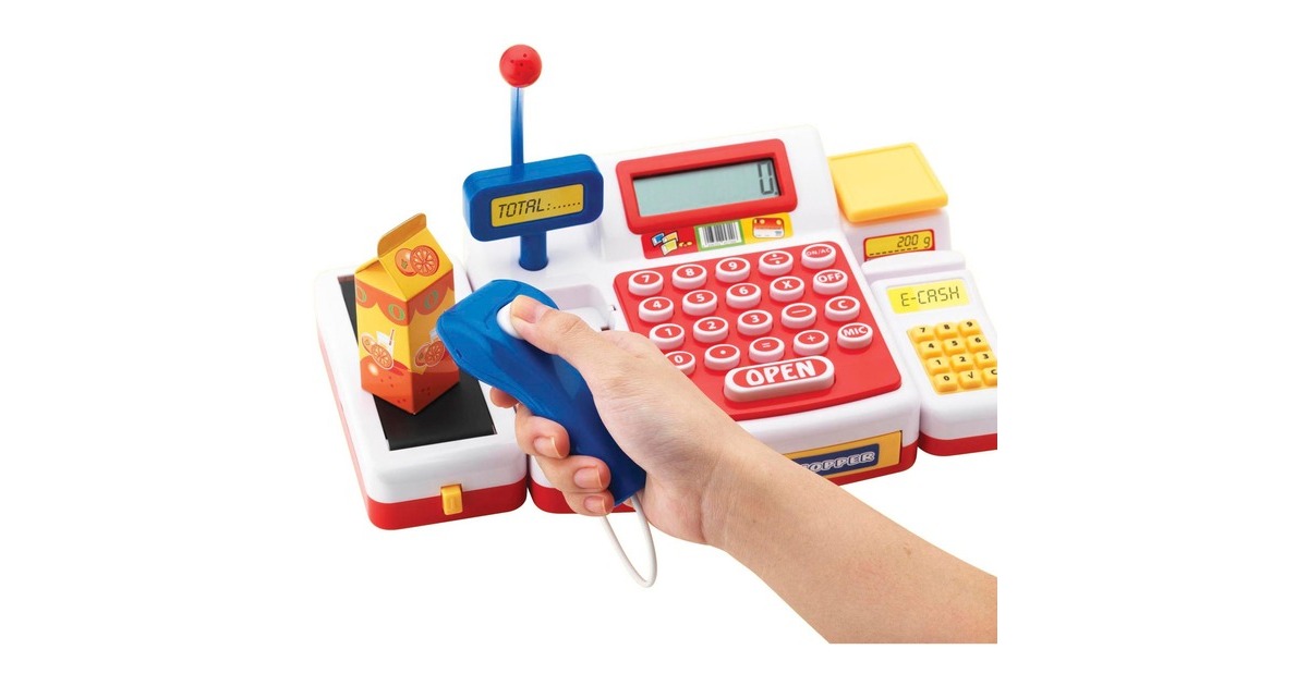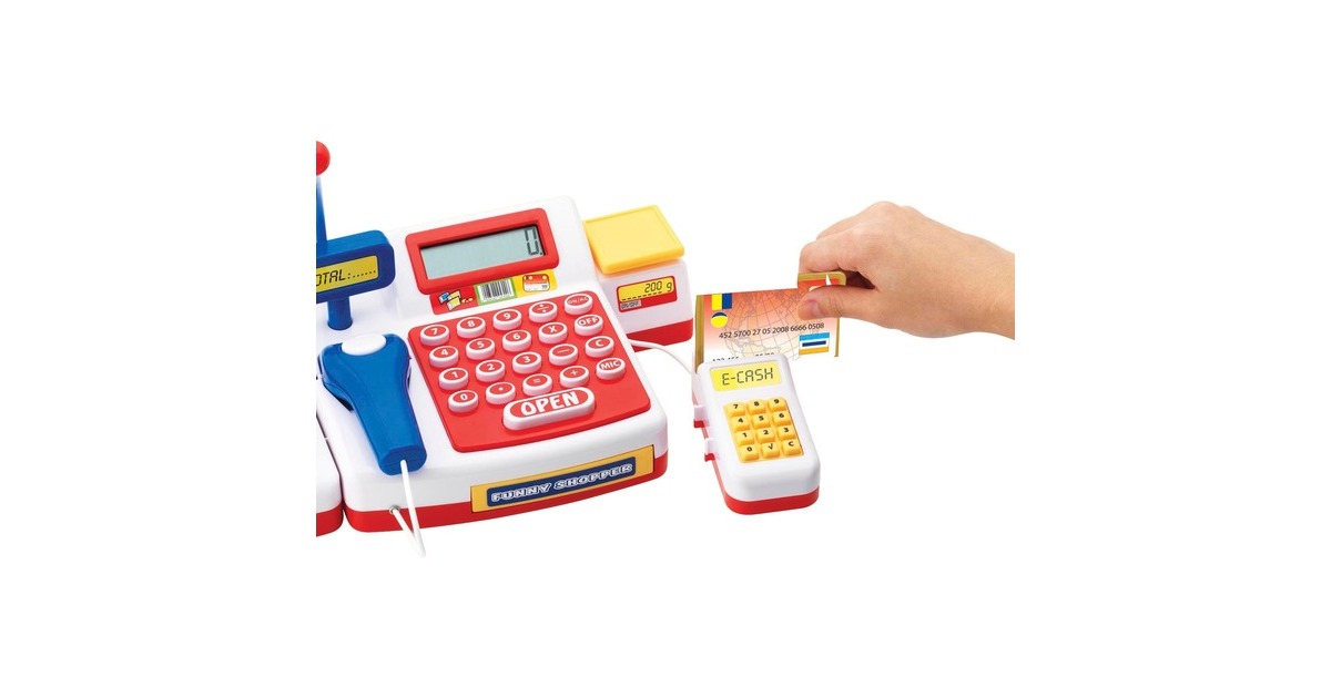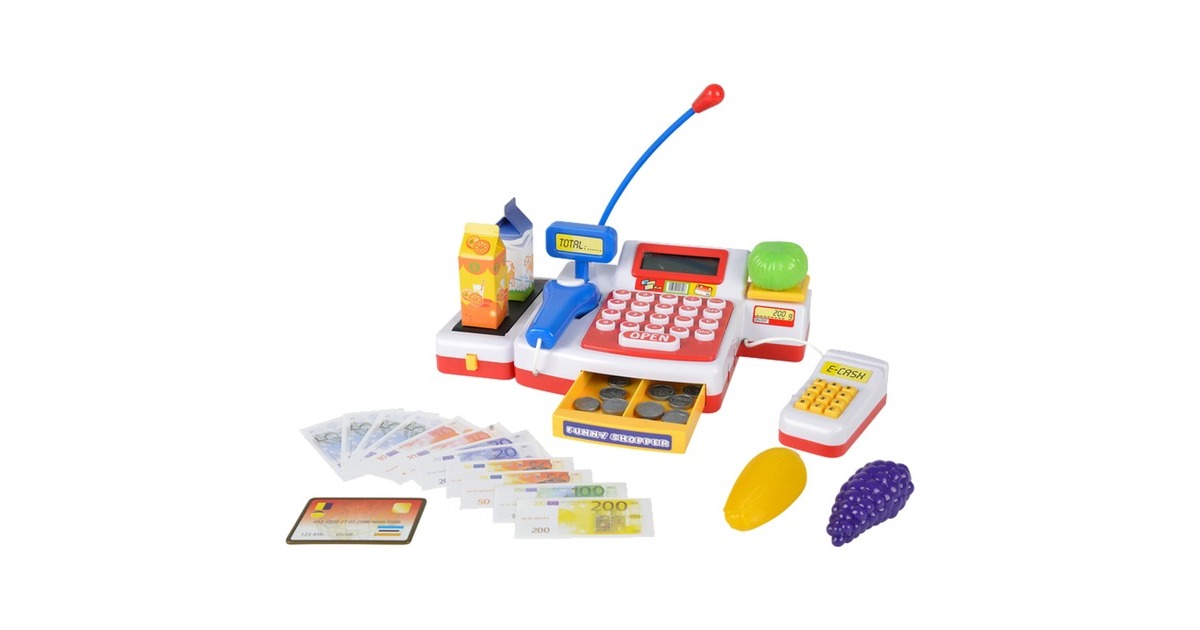Bezahlen kann der Kunde dann bar mit dem Spielgeld oder mit der EC-Karte. Ziehe die Karte durch das Lesegerät und gebe die Geheimzahl ein (Piep-Geräusch). Somit ist die Ware auch bezahlt. Das Bargeld kommt in die Geldschublade. Diese kann durch Drücken des „Open“ Knopfes geöffnet werden. Mit Scanner, Rechner, Laufband, Kartenlesegerät, Waage und weiteren Zubehör kannst du perfekt in die Rolle der Verkäuferin vom Supermarkt um die Ecke schlüpfen.
