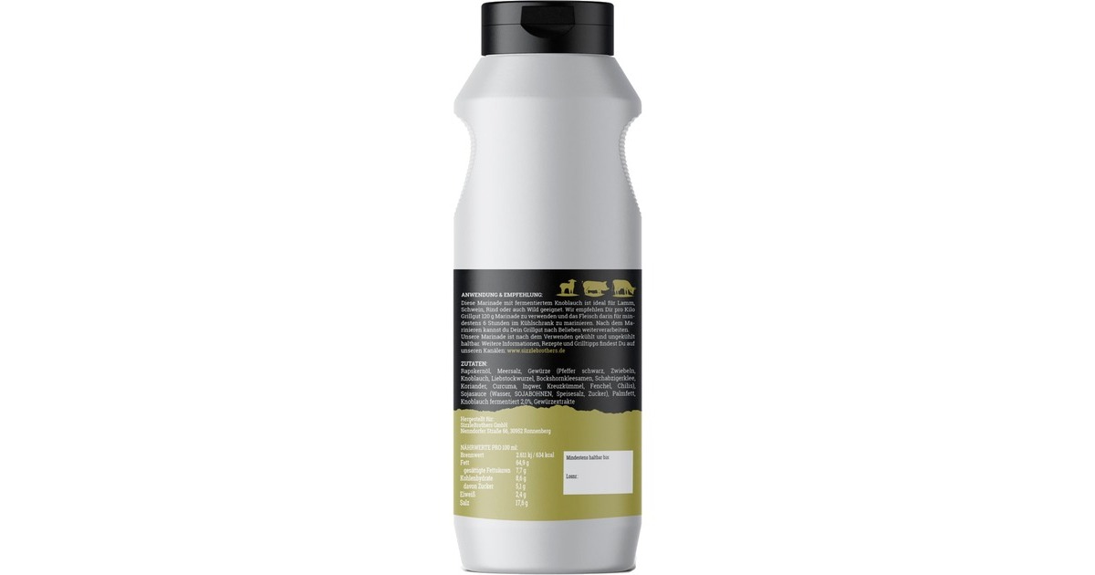 #Schwarzerknobi steht für eine einzigartig leckere Knoblauchmarinade, die Grillspezialitäten eine besondere Note gibt. Ob Fleisch, Fisch, Gemüse oder vegane Speisen, mit dieser Marinade hat man noch mehr Möglichkeiten auf dem Grill. Mit flüssigen Marinaden bringt man noch mehr Geschmack an das Grillgut und es ist eine ideale Alternative für Trockenrubs. Die leckere Marina harmoniert z.B. herrlich mit Ribs, Pulled Pork oder klassischen Nackensteaks. Die SizzleBrothers Marinade kommt in der praktischen und wiederverschließbaren 500 ml Flasche und eignet sich zum Marinieren von ca. 5 kg Grillfleisch.Art.-Nr.: 1658856