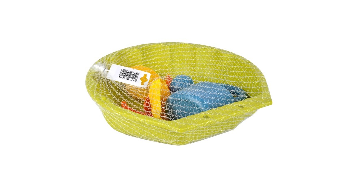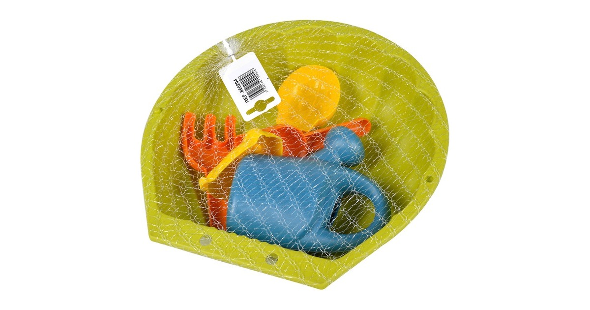 Sandspielmuschel mit Gießkanne, Rechen, Schaufel und zwei Sandförmchen |