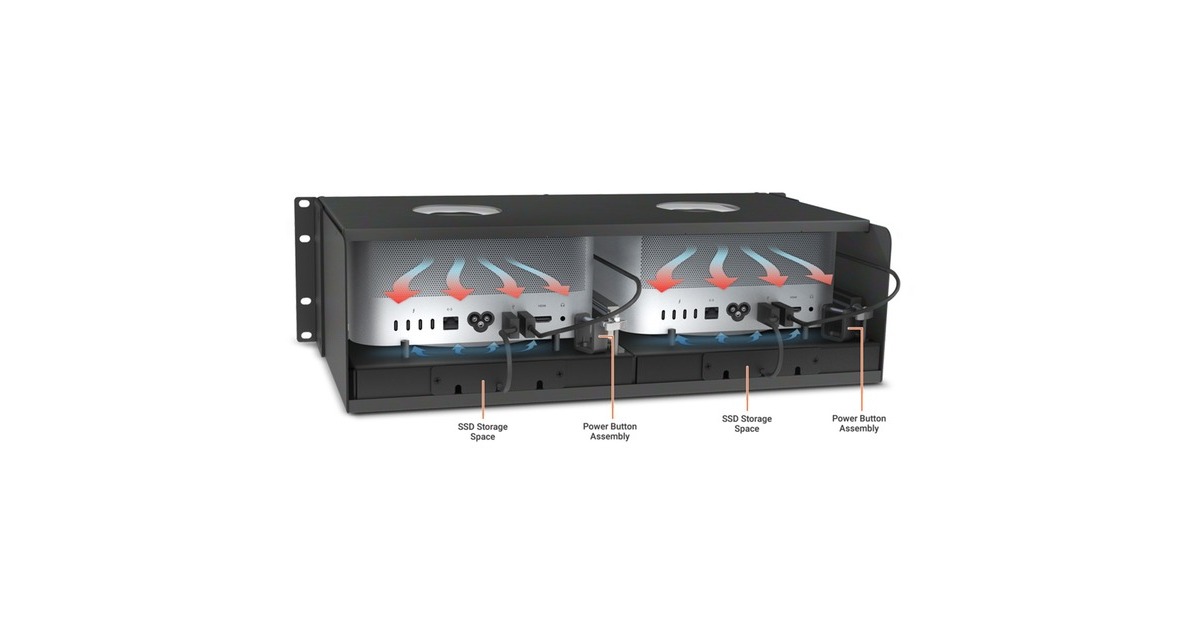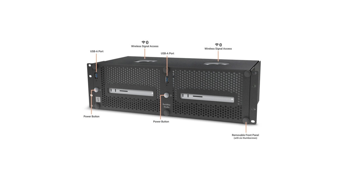Das Sonnet RackMac Studio ist ein 3 Höheneinheiten Gehäuse zur Installation und Sicherung von einem oder zwei Mac Studio Computern in einem Standard 19" Rack, die sich hinter einer schnell und einfach abnehmbaren Frontblende befinden. Über die praktische Frontblende kann man die Mac Studio Computer mit ihren eigenen Stromtasten an der Vorderseite einschalten, USB-Geräte über Passthrough-USB-A-Anschlüsse anschließen und auf die Frontanschlüsse und SD-Kartensteckplätze der Computer zugreifen. Das Design von RackMac Studio ermöglicht das einfache Anschließen und Trennen von Kabeln, ohne dass die Computer aus dem Gehäuse entfernt werden müssen. Öffnungen an der Oberseite des RackMac Studio sorgen für einen ungehinderten Zugang zu drahtlosen Signalen. Das RackMac Studio ist so konzipiert, dass in den meisten Konfigurationen (je nach Rack-Typ und Position im Rack) normaler WiFi- und Bluetooth-Funkbetrieb möglich ist, sodass man drahtlose Geräte und iOS-Gerätesteuerungs-Apps verwenden kann.Art.-Nr.: 1870009