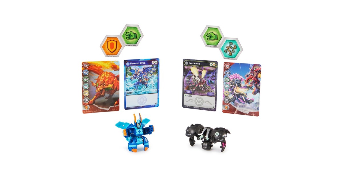 Metall-Aufbewahrungsbox, 1 exklusiver Bakugan (Darkus Sectanoid), 1 Überraschungs-Bakugan, 4 BakuCores, 2 Charakterkarten, 2 Portalkarten |