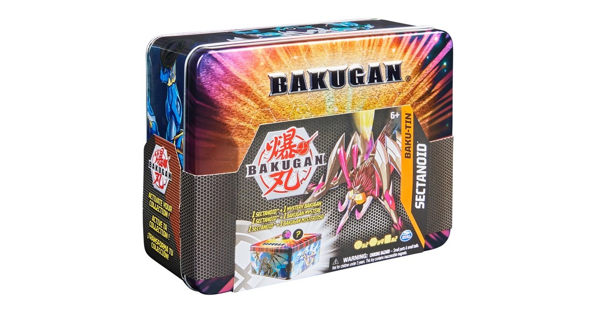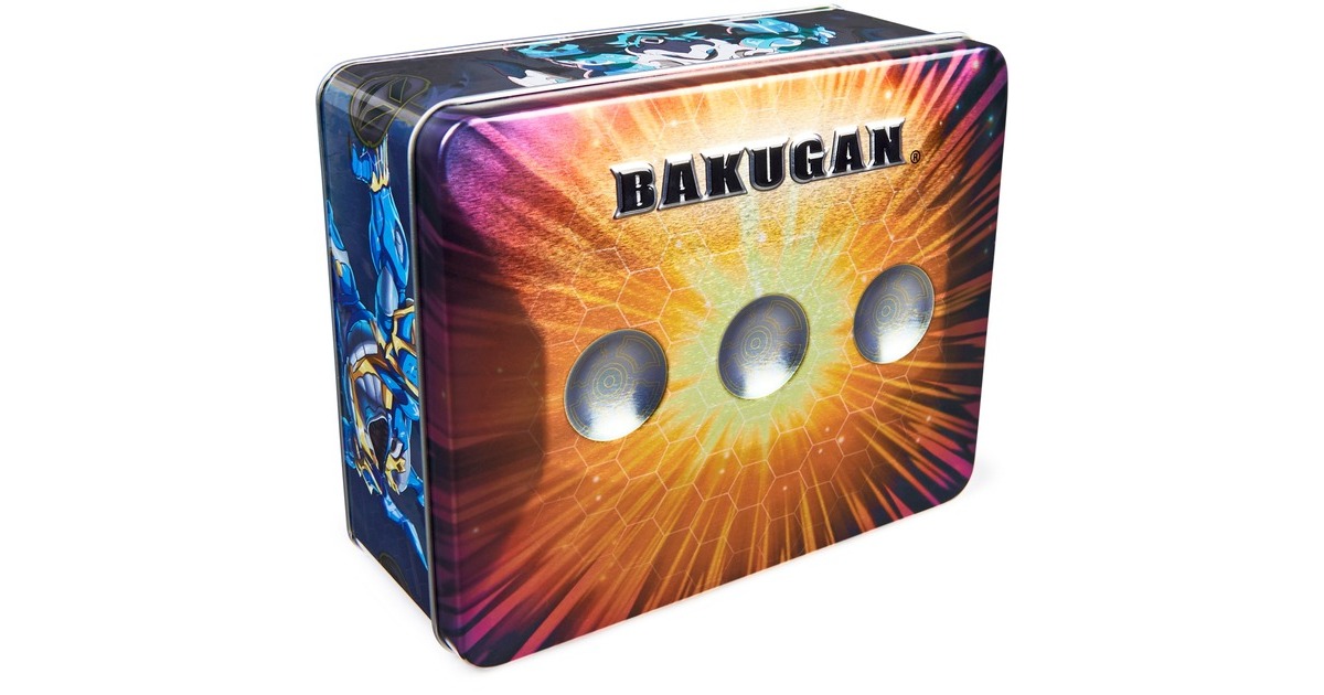 In der hochwertigen Baku-Tin Aufbewahrungsbox aus Metall lässt sich eine Bakugan-Sammlung ideal verstauen. Gleichzeitig können die liebsten Bakugan darauf direkt ausgestellt werden, da sie sich über den integrierten Magnetmechanismus öffnen. Außerdem kann die Auswahl der 3 Bakugan, die für das Duell genutzt werden sollen, in den Mulden platziert werden. Soll eine konkrete Auswahl an Bakugan zu Freunden mitgenommen werden, lassen sich exakt 6 Bakugan, 12 BakuCores und 2 Karten-Decks mit bis zu 40 Karten in den integrierten Einlegeböden unterbringen. Neben der Metallbox im coolen Bakugan-Design enthält die Packung einen exklusiven Darkus Sectanoid Bakugan und einen Überraschungs-Bakugan zur Erweiterung der eigenen Sammlung.