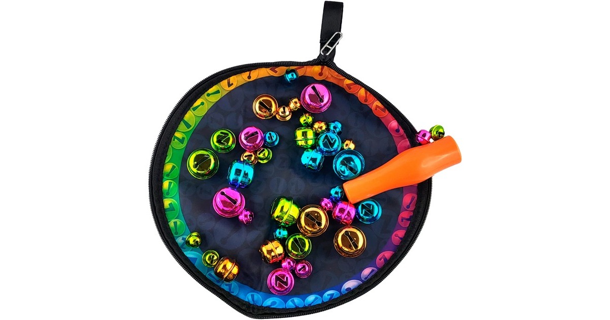 1x Neopren-Aufbewahrungstasche/Spielfläche, 1 magnetischer Stab, 40 Glöckchen, Anleitung |