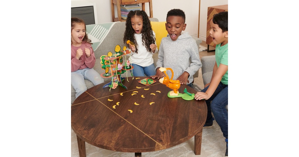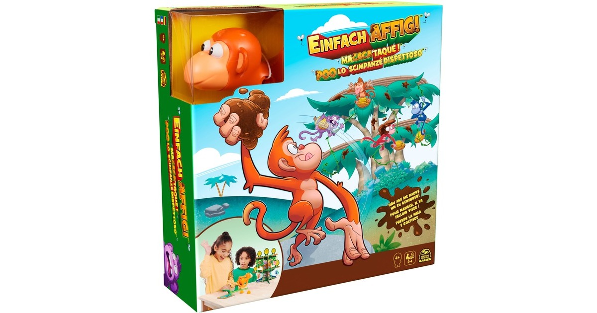 Bei Einfach affig von Spin Master Games ist witzige Affen-Action angesagt, denn das Motto lautet: „Hau auf die Kacke, um zu gewinnen“. Mit Kacke aus Knete und einem Affen-Katapult versuchen alle Spieler, möglichst viele Bananen vom großen Baum zu holen, um so mit ihren Äffchen die Lianen hochzuklettern. Wer zuerst in der Baumkrone ankommt, gewinnt. Witziges Geschicklichkeits-Spiel mit Kacka-Action und tollem 3D-Spielmaterial. Für 2-4 Spieler ab 4 Jahren. Spieldauer: ca. 25 Minuten.Art.-Nr.: 100008168