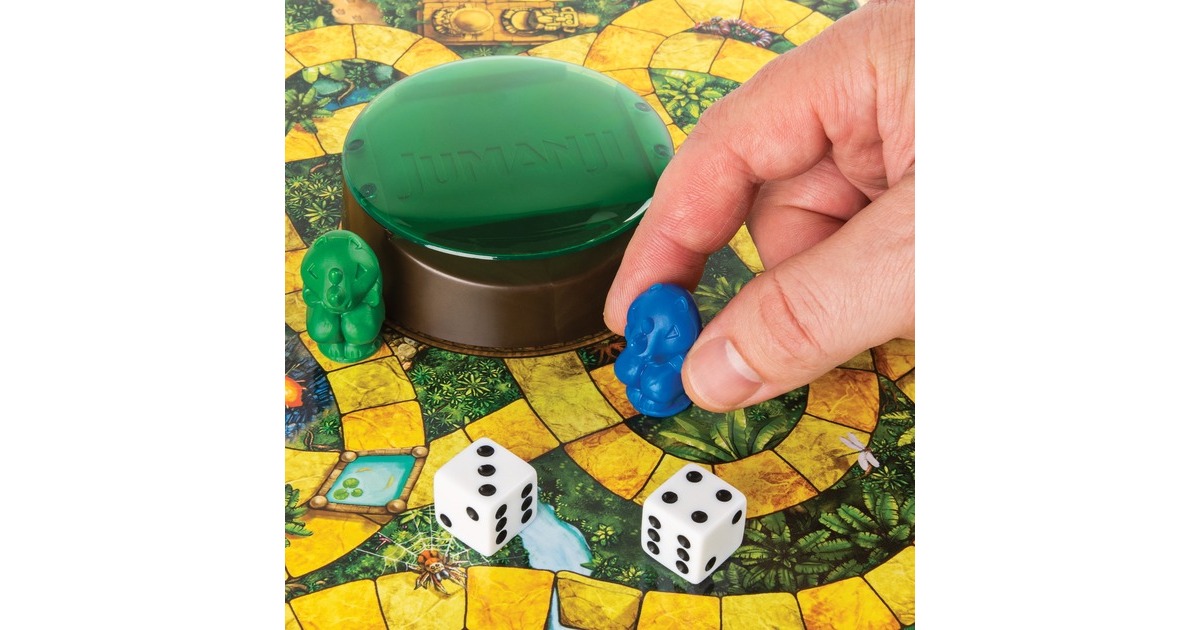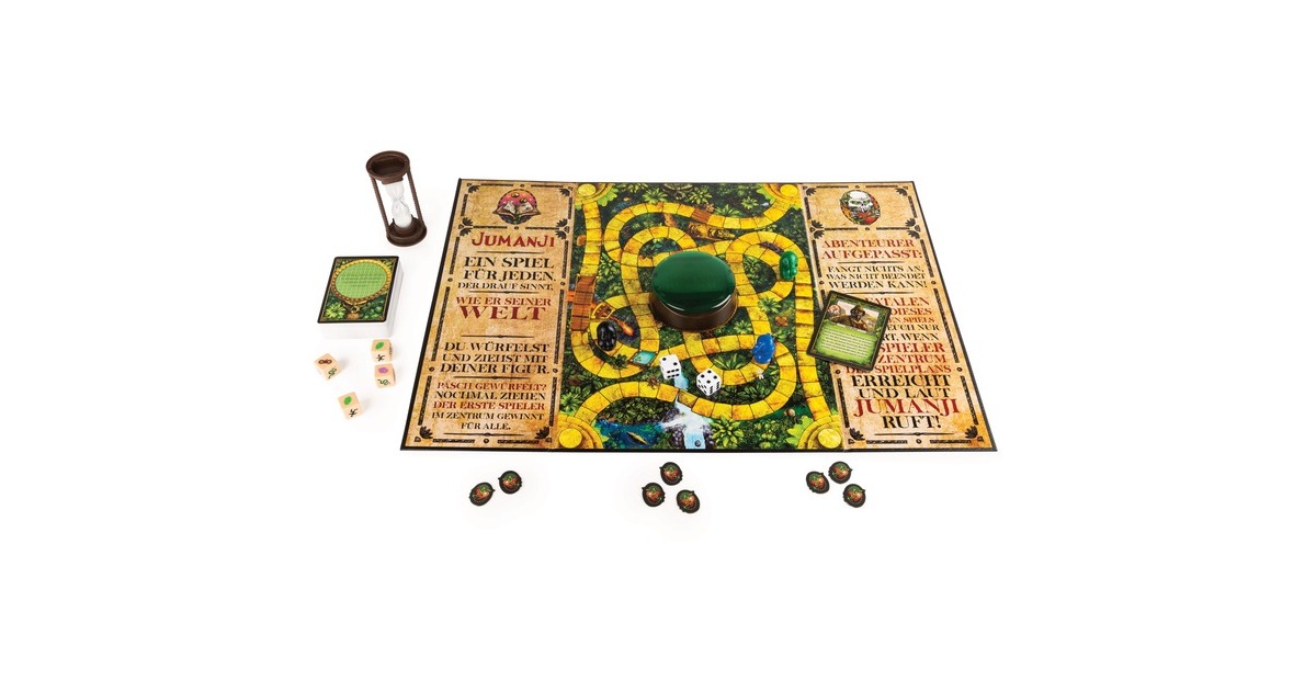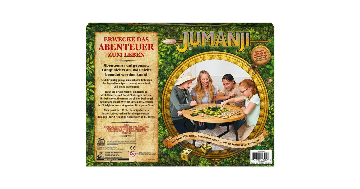 Jumanji - das Spiel zum Kino-Welterfolg. Abenteurer aufgepasst: Fangt nichts an, was nicht beendet werden kann. Seid ihr mutig genug, um euch den Gefahren des legendären Spiels Jumanji zu stellen? Und sie zu bezwingen? Nutzt die Grüne Kuppel, um Reime zu dechiffrieren, und deckt Challenges auf, die ihr bei eurem Abenteuer durch den Dschungel bewältigen müsst. Wer als Erstes das Zentrum des Spielplans erreicht, gewinnt für´s ganze Team. Aber passt auf. Verliert ein Spieler sein letztes Leben, verliert ihr alle gemeinsam. Modernes kooperatives Familienspiel, das die schnelle Auffassungsgabe fördert - hier muss gut kommuniziert, gerätselt und manchmal auch Pantomime gespielt werden, um als Team gegen das Spiel zu gewinnen - dabei wird das ganze Spiel-Zimmer zur Kulisse für das große Dschungelabenteuer. Jumanji—für 2–4 mutige Abenteurer ab 8 Jahren.Art.-Nr.: 1761442