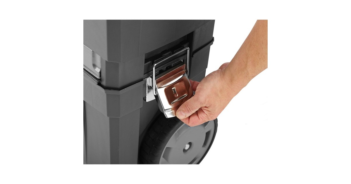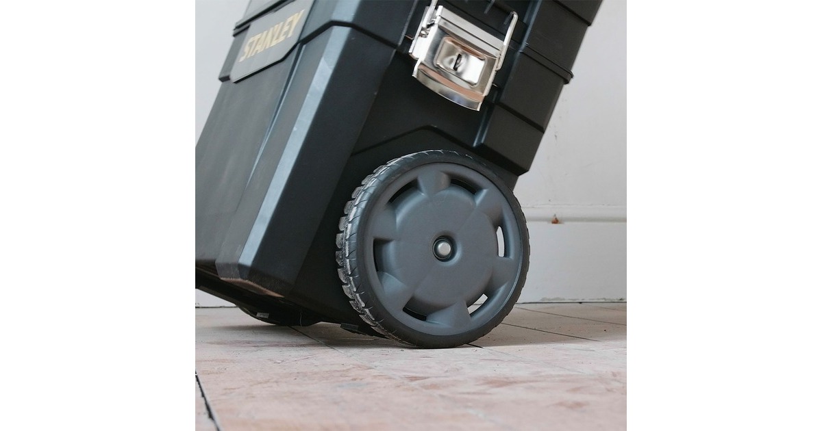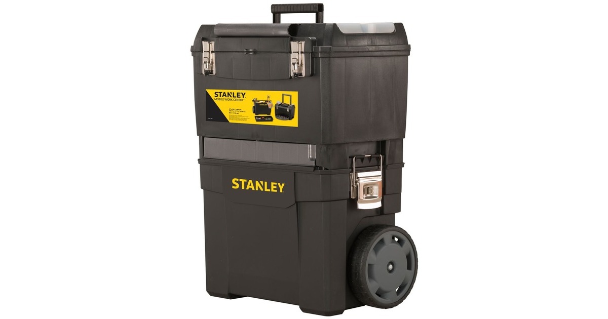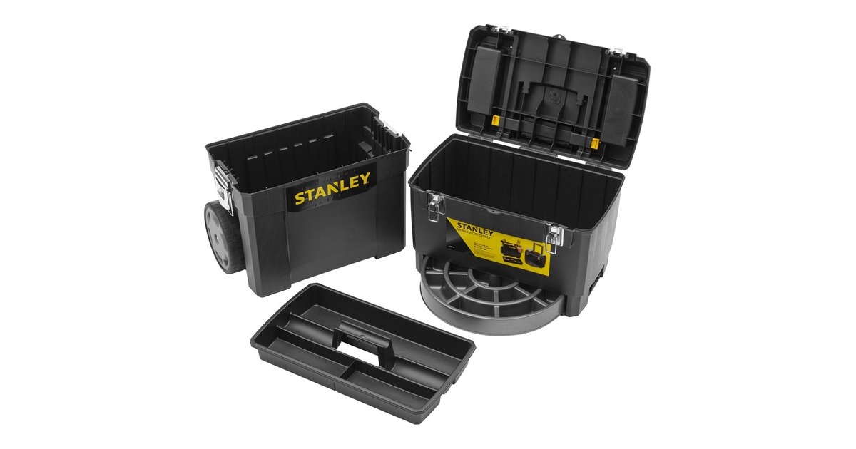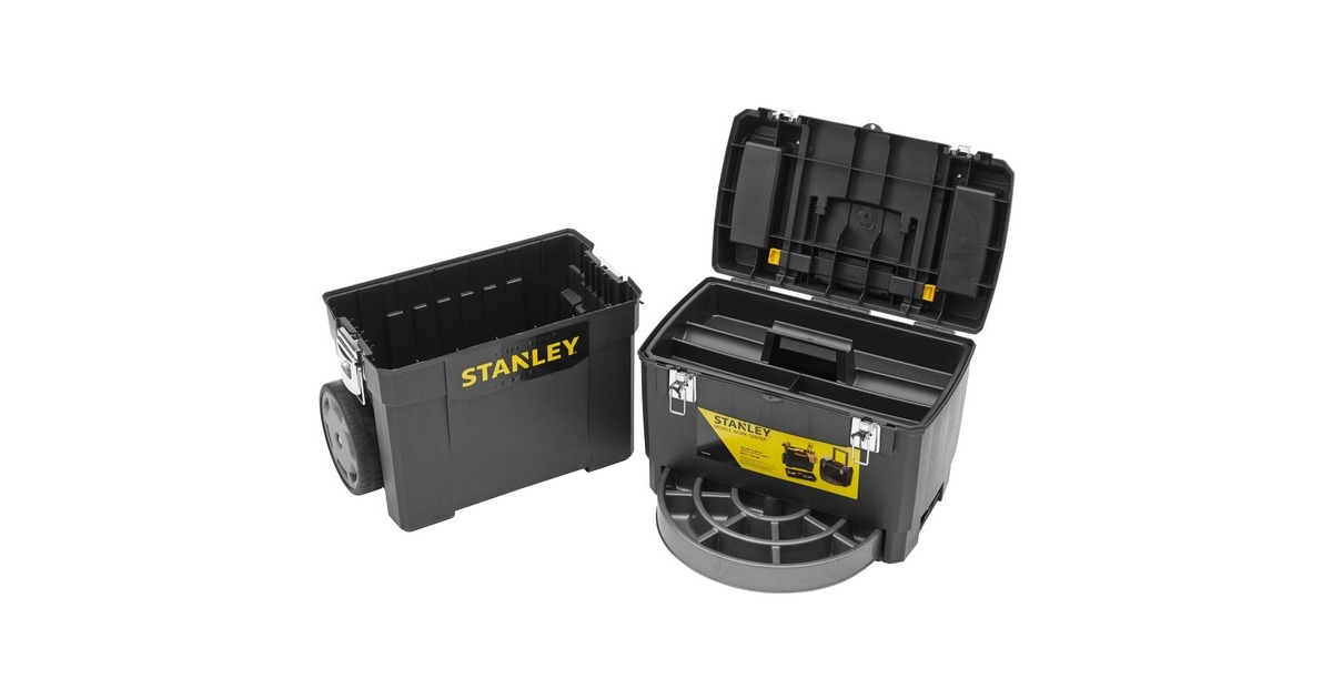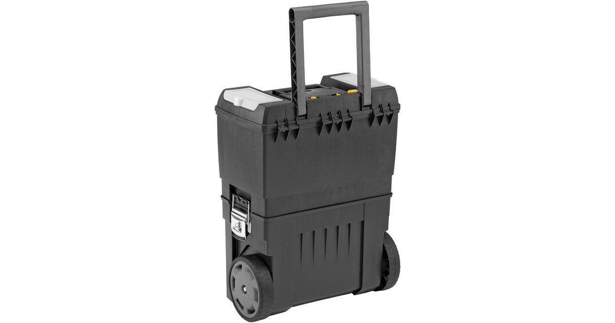 Die modular aufgebaute Rollende Werkstatt (Rolling Workshop) 1-93-968 von Stanley ist aus robustem Kunststoff gefertigt. Die Rollende Werkstatt besteht aus zwei separat verwendbaren Einheiten. Die obere Einheit bietet eine geräumige, abnehmbare Werkzeugbox mit einer ausziehbaren, drehbaren Aufbewahrungsmöglichkeit für Kleinteile und einen Organizer im Deckel, die untere Einheit bietet ein großes 25 Liter Fach mit entnehmbarer Trage zur Aufbewahrung größerer sperriger Werkzeuge. Dank des ergonomischen Handgriffs und der robusten großen Räder lässt sich die rollende Werkstatt auf jedem Untergrund leicht rangieren und transportieren. Die beiden Boxen lassen sich mit großen robusten Metallschließen miteinander verbinden, die außerdem mit einem Vorhängeschloss verschließbar sind.Art.-Nr.: 1702465