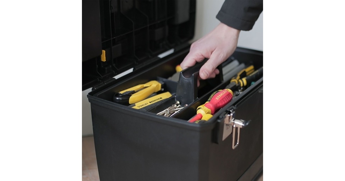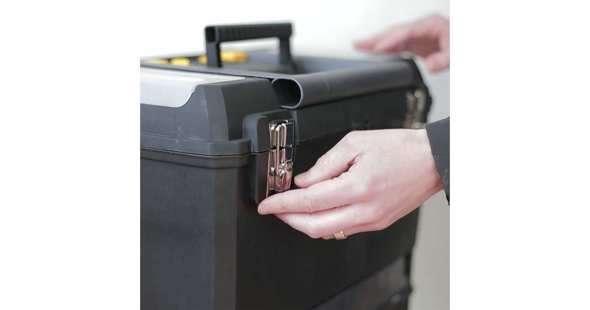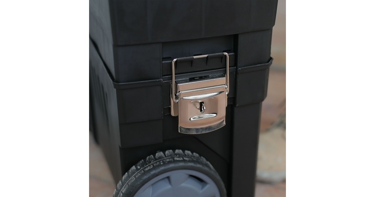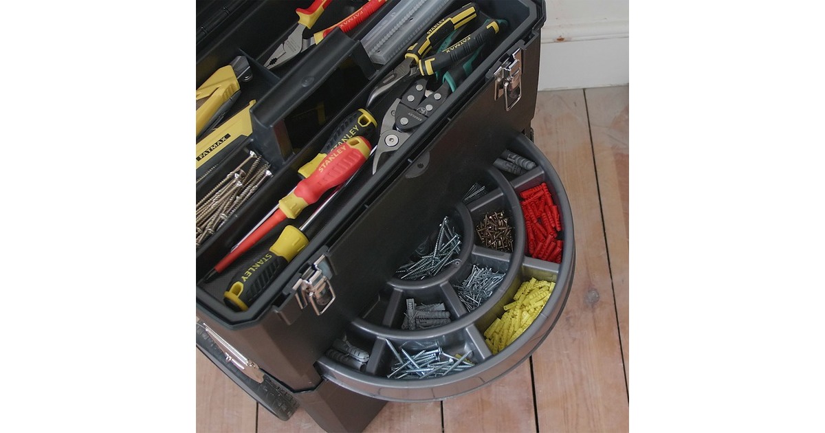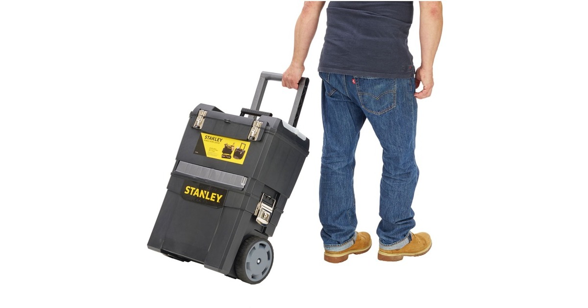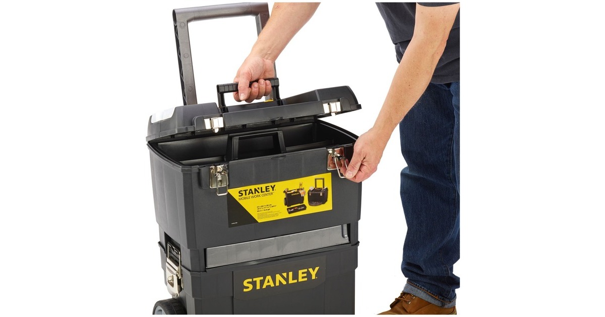 Die modular aufgebaute Rollende Werkstatt (Rolling Workshop) 1-93-968 von Stanley ist aus robustem Kunststoff gefertigt. Die Rollende Werkstatt besteht aus zwei separat verwendbaren Einheiten. Die obere Einheit bietet eine geräumige, abnehmbare Werkzeugbox mit einer ausziehbaren, drehbaren Aufbewahrungsmöglichkeit für Kleinteile und einen Organizer im Deckel, die untere Einheit bietet ein großes 25 Liter Fach mit entnehmbarer Trage zur Aufbewahrung größerer sperriger Werkzeuge. Dank des ergonomischen Handgriffs und der robusten großen Räder lässt sich die rollende Werkstatt auf jedem Untergrund leicht rangieren und transportieren. Die beiden Boxen lassen sich mit großen robusten Metallschließen miteinander verbinden, die außerdem mit einem Vorhängeschloss verschließbar sind.Art.-Nr.: 1702465