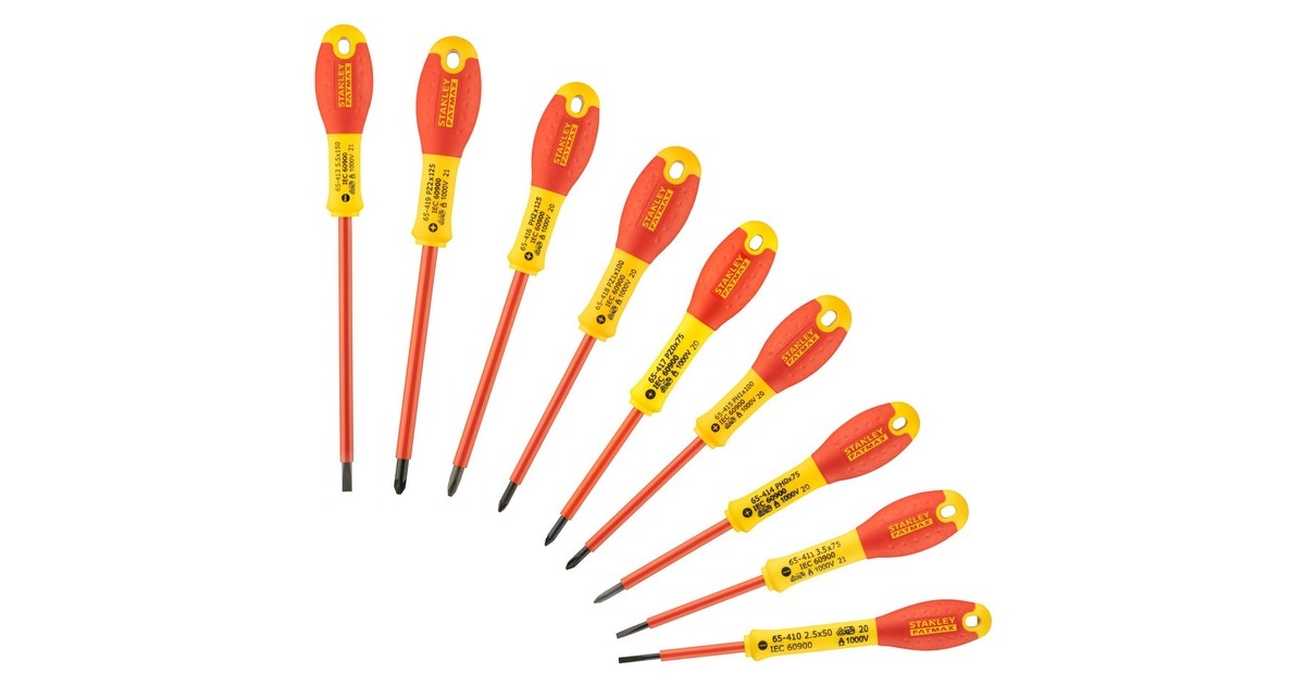 Das Schraubendreher-Set FatMax FMHT65439-0 von Stanley enthält 10 Schraubendreher mit ergonomischem Soft-Grip Handgriff. Der rutschfeste Komfortgriff mit glatten und strukturierten Bereichen ergibt eine optimale Kombination aus hohem Griffkomfort und ergonomischem Krafteinsatz. Er ermöglicht eine optimale Anpassung an die Hand und damit ein maximales Anzugsmoment. Die Klinge aus Chrom-Vanadium Qualitätsstahl bietet hohe Widerstandskraft und reduzierte das Bruchrisiko der Spitze. Der Griff ist direkt auf die Klinge aufgebracht, das macht die Verbindung von Klinge und Griff praktisch unzerstörbar. Die zweifarbige Griffisolation aus Bi-Material isoliert bis 1.000Volt (VDE/GS, IEC 60900).Art.-Nr.: 1840163
