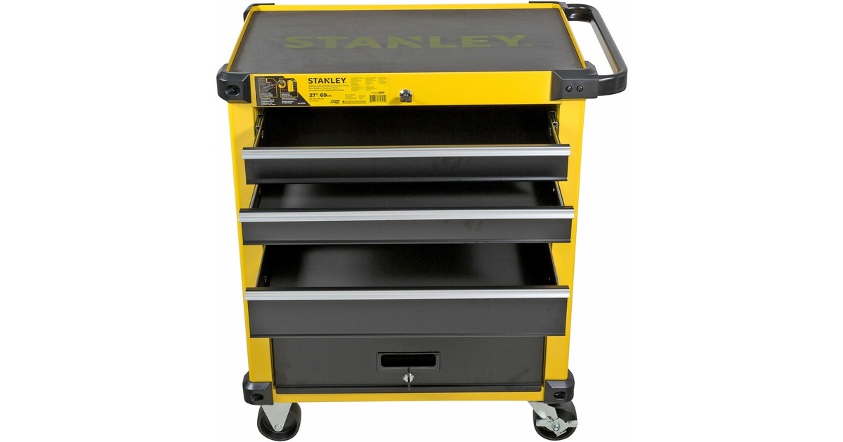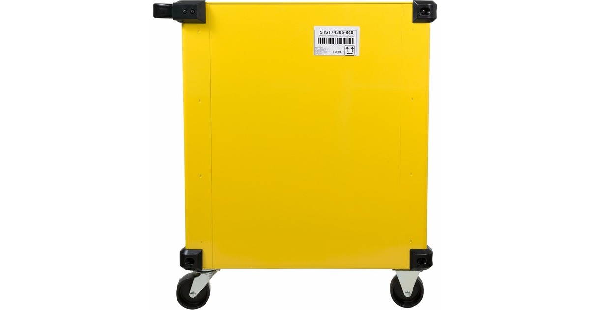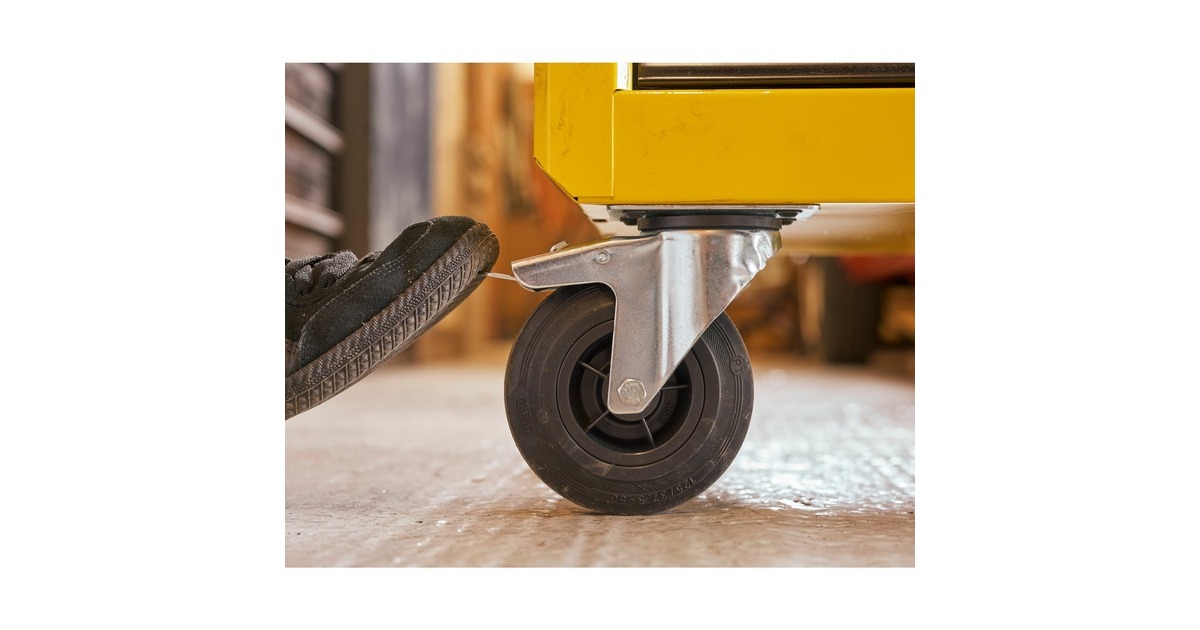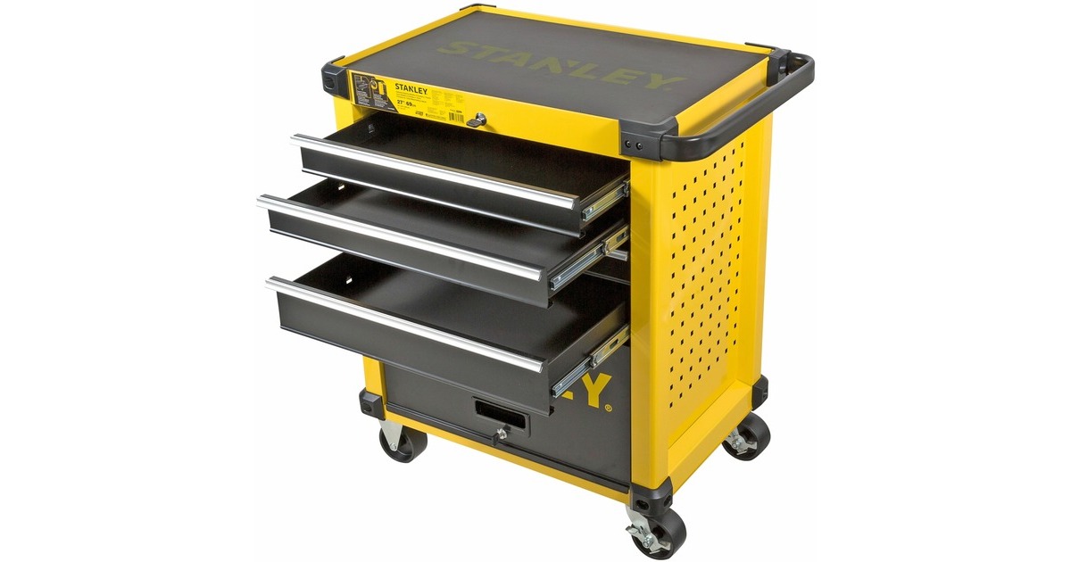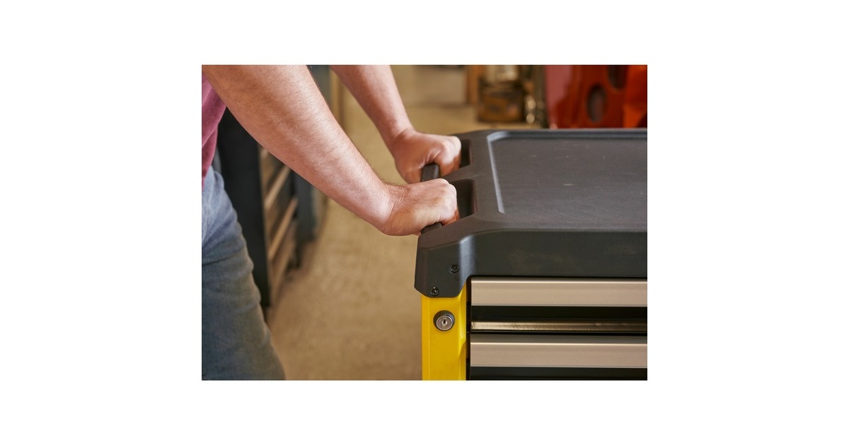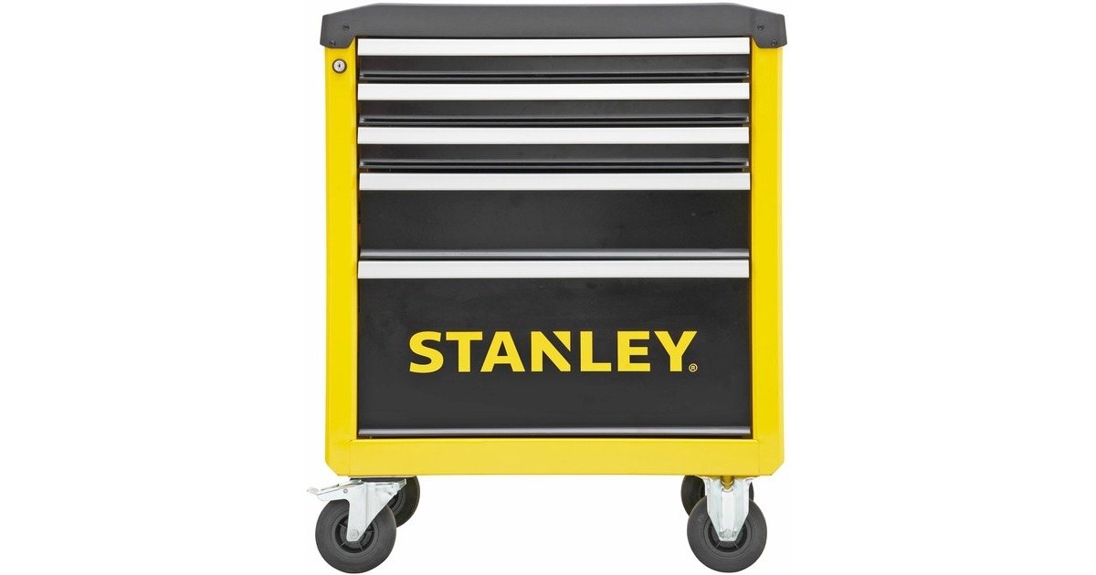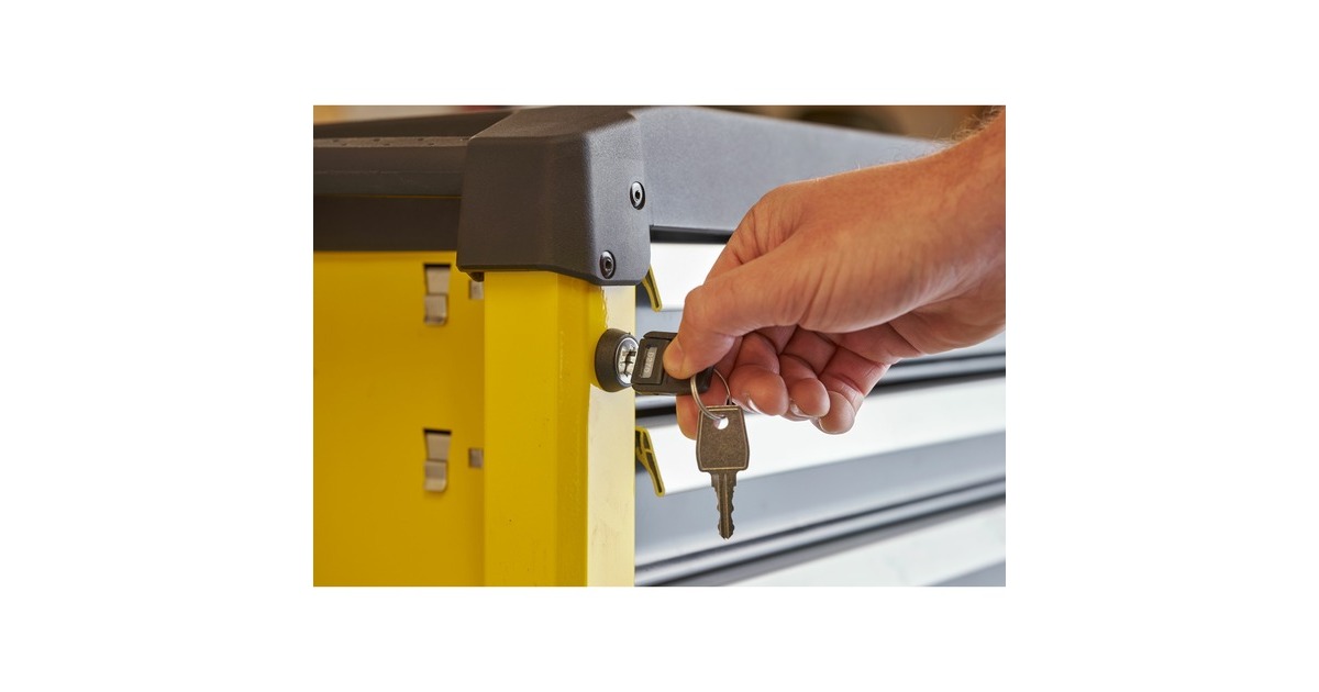 Der Werkstattwagen STST74305-1 von Stanley verfügt über eine tiefe, eine mittlere und drei flache Schubladen zum ordentlichen Aufbewahren von Werkzeugen und Zubehörteilen. Die Schubladen sind mit kugelgelagerten Führungen sowie Anti-Rutsch-Schubladeneinlagen ausgestattet und eignen sich auch für schwerere Werkzeuge. Die robuste Arbeitsplatte mit integriertem Griff bietet Mulden zur Aufbewahrung wichtiger Teile und Zubehörteile, sowie Löcher für griffbereite Schraubendreher. Der Werkstattwagen STST74305-1 rollt auf zwei feststehenden Rollen und zwei Lenkrollen, und lässt sich mit der Feststellbremse sicher parken. Die abgerundeten Ecken reduzieren das Verletzungsrisiko. Der abschließbare Werkstattwagen ist mit zwei Schlüsseln ausgestattet.Art.-Nr.: 1840075
