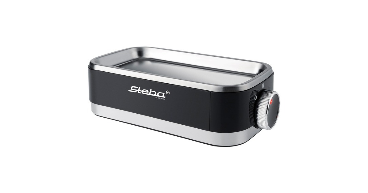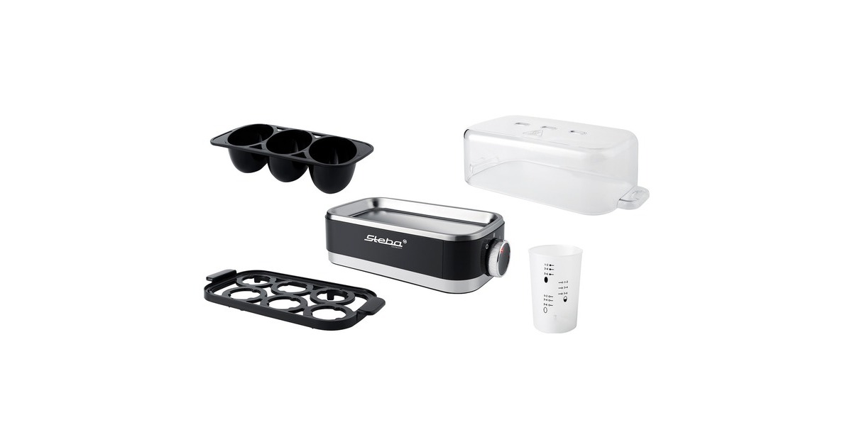 Der elegante Eierkocher EK 7 von Steba kocht bis zu sechs Eier. Mit dem zugehörigen Meßbecher sowie dem Eierstecher gelingen die Eier nach Wunsch, auch pochierte Eier sind mit dem enthaltenen Einsatz möglich. Die Bedienung erfolgt ganz einfach über einen Drehschalter. Dann füllt man kaltes Wasser in die Edelstahlkochschale und deckt die Eier mit einer Klarsichthaube ab. Wenn die Eier fertig sind ertönt ein akustisches Signal. Der praktische Eiertray mit Tragegriff lässt sich zum Abschrecken herausnehmen. Für weiteren Bedienkomfort sorgen die Warmhaltefunktion und eine Kontrolleuchte. Art.-Nr.: 1594521