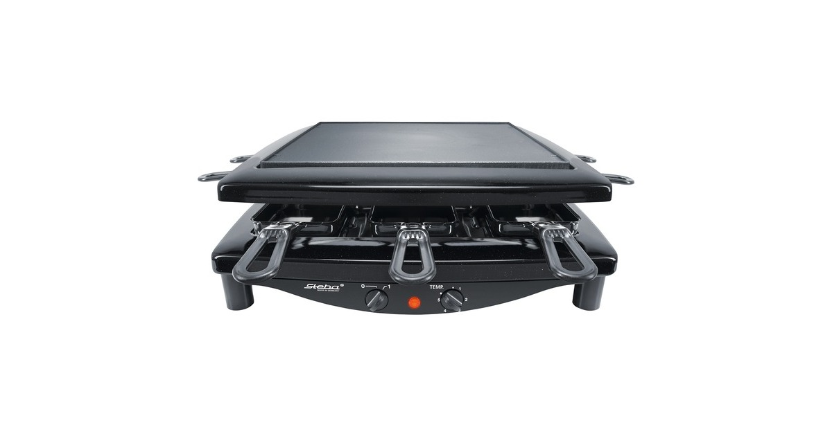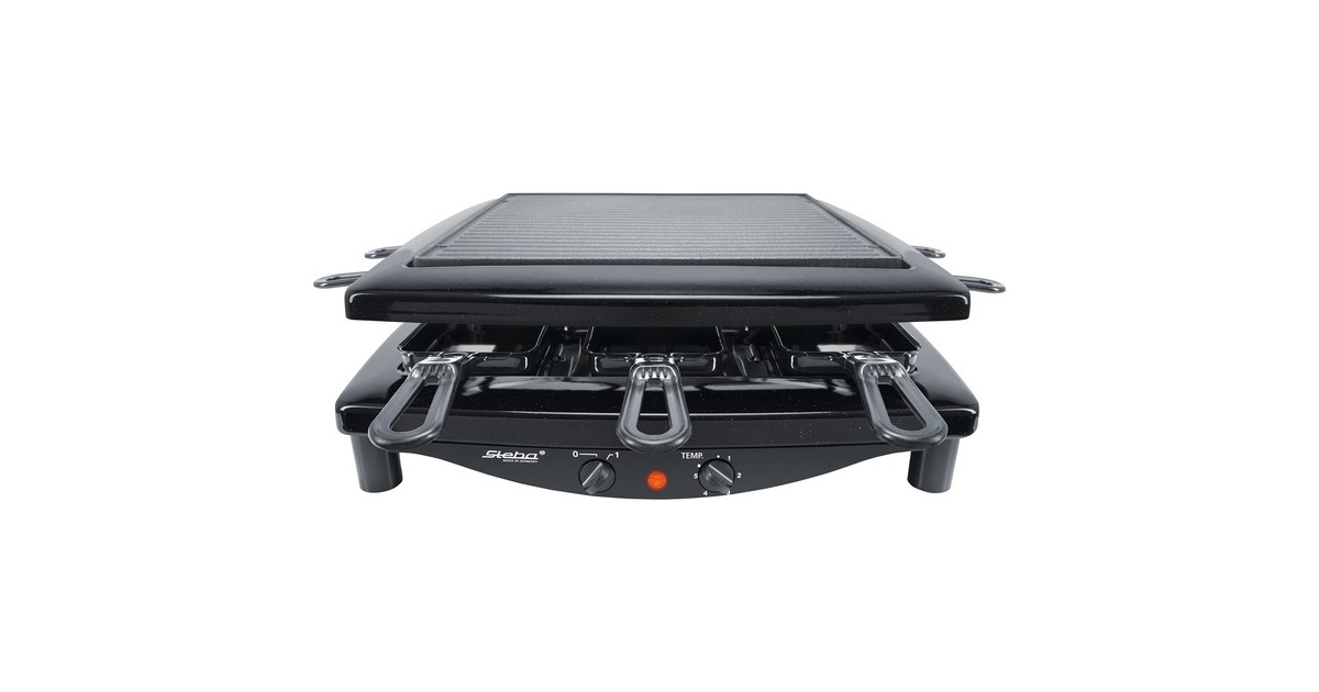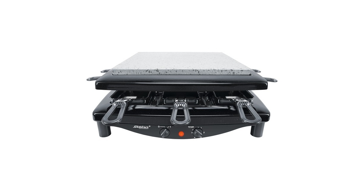 Der Steba RC 3 Plus Raclettegrill mit acht Pfännchen ist genau das Richtige für einen abend mit Freunden. Zum Zubereiten der verschiedensten Speisen stehen einem zwei Grillplatten zur Auswahl, eine wendbare, emaillierte Stahlguß-Grillplatte und eine kratzfeste Natursteingrillplatte. Die acht emaillierten Pfännchen sind schneid und kratzfest und dazu noch spülmaschinengeeignet. Die Grillfläche hat eine Länge von 26 cm und eine Breite von 26 cm. Auf der Vorderseite des RC 3 Plus befindet sich ein stufenloser Temperaturregler und ein Ein-/Ausschalter.Art.-Nr.: 934750