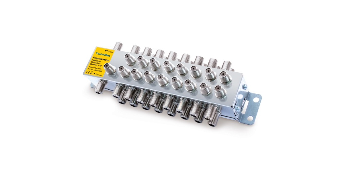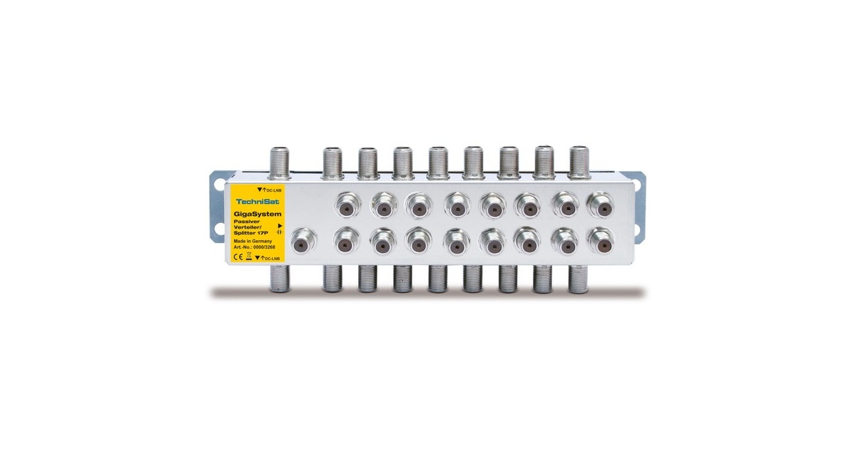 Der passive Verteiler 17P dient zur Sat-Signalaufteilung bei größeren Verteilanlagen. Dort wo zwei Stämme bedient werden sollen, kommt der 17P zum Einsatz. Er verfügt über 17 Eingänge (16 SAT, 1 Terrestrisch) und 2 x 17 Ausgänge. Durch seine geringe Verteildämpfung von nur 4 dB lassen sich auch längere Kabelstrecken projektieren. Durch die Bauform des Gehäuses lässt sich der 17P mit F-Schnellverbindern problemlos auf GigaSystem-Multischalter kaskadieren. Art.-Nr.: 1617955