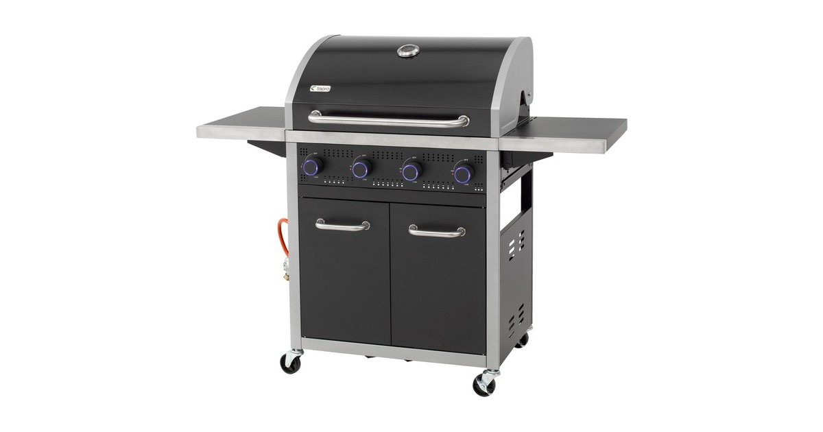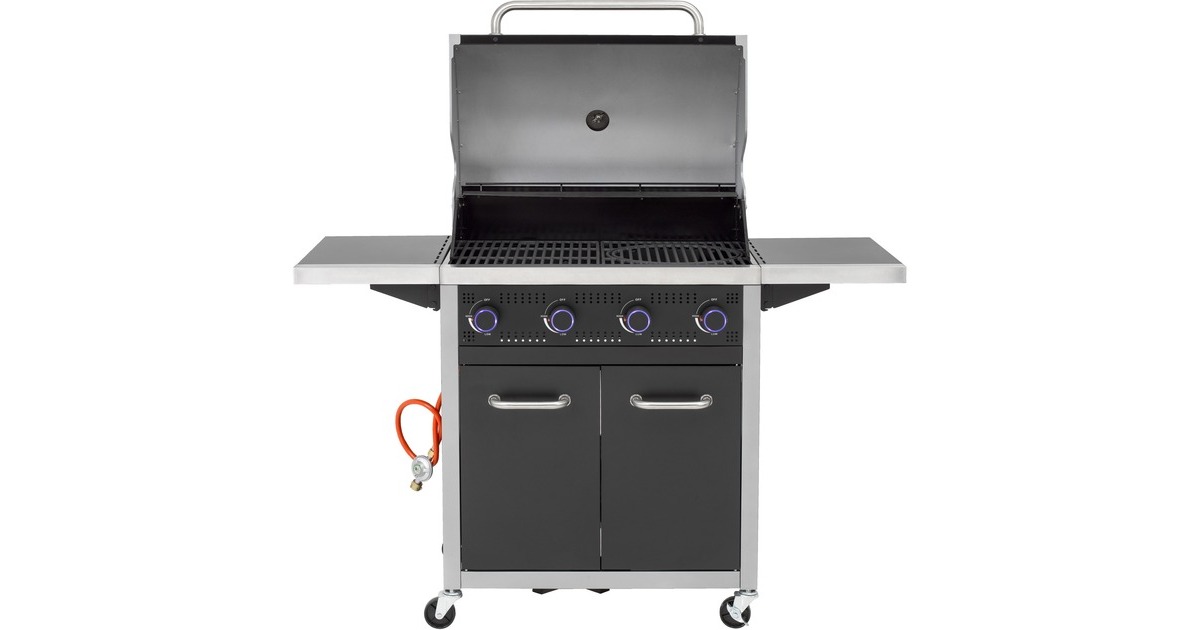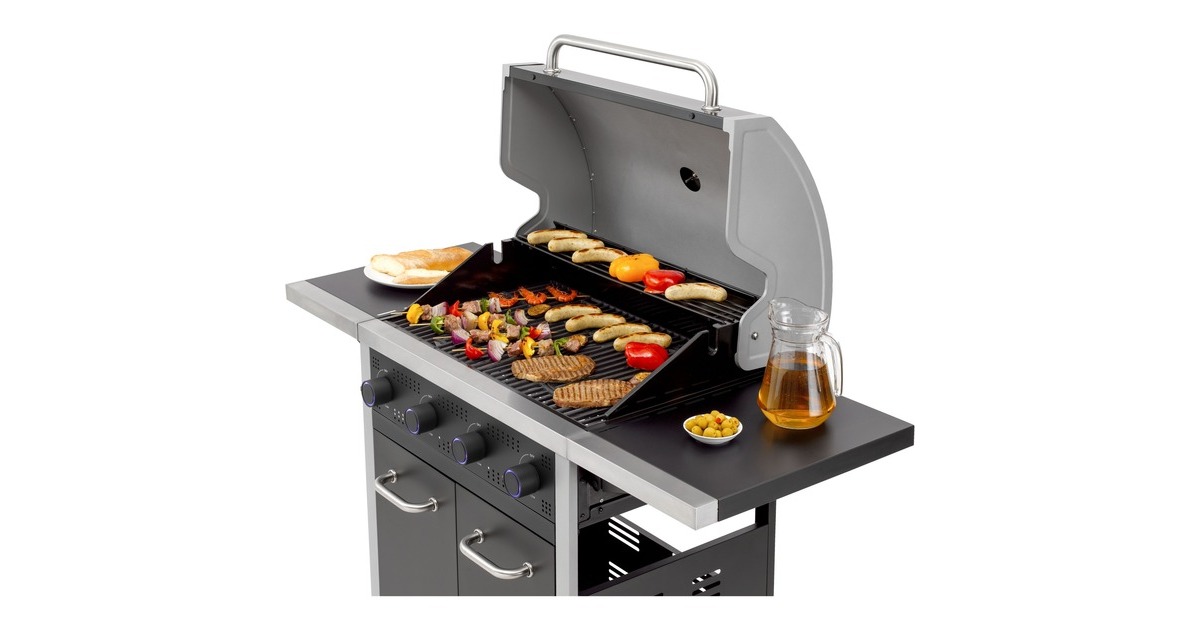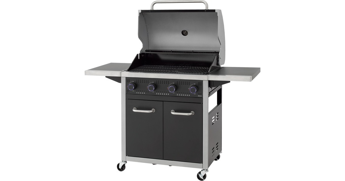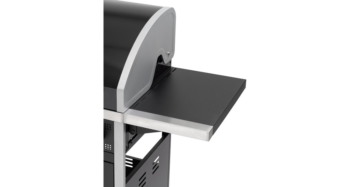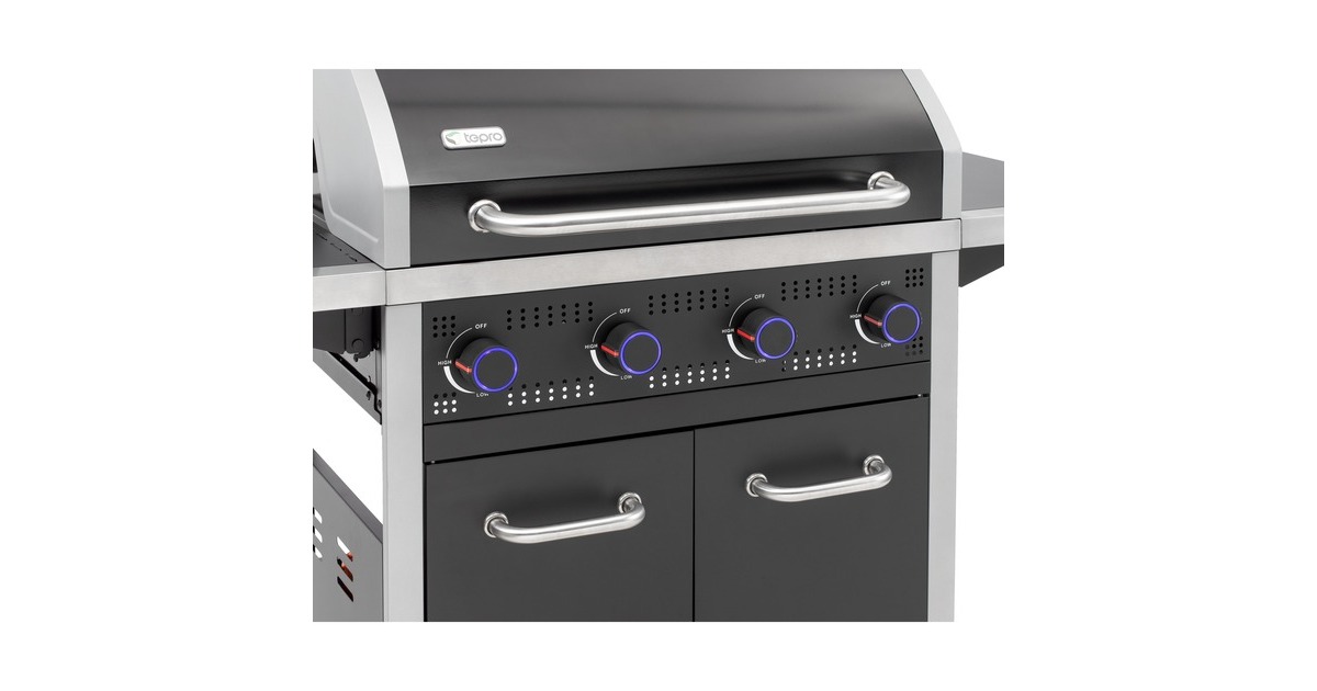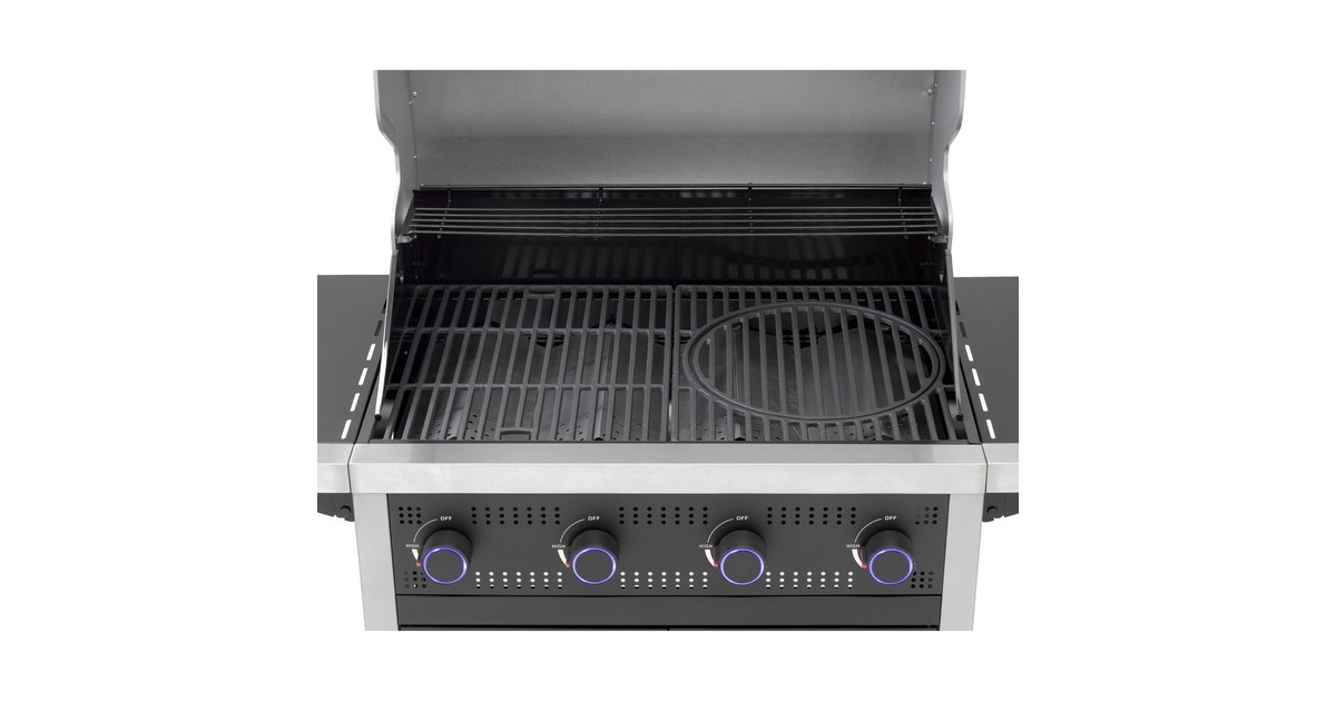 Der Gasgrill Northport 4 von Tepro ist in einen stabilen Grillwagen integriert und mit vier Lenkrollen ausgestattet. Die geteilte Grillfläche aus Gusseisen verfügt über einen herausnehmbaren Grillrosteinsatz für das tepro Rost in Rost System und einen zusätzlichen emaillierten Warmhalterost. Im Deckel mit Edelstahl-Griff ist ein Thermometer integriert, um jederzeit die Temperatur überprüfen zu können. Der Gasgrill Northport 4 bietet außerdem zwei abklappbare Seitenablagen, Drehregler mit LED Beleuchtung und eine in die Regler integrierte Piezo-Zündung. Heruntergetropftes Fett lässt sich nach dem Grillen dank der Fettauffangschublade mit Griff auf der Rückseite leicht entnehmen und entsorgen. Im geräumigen Unterschrank befindet sich hinter den beiden Türen noch zusätzlicher Stauraum und eine Gasflaschenhalterung für 5kg-, 8kg- und 11kg-Gasflaschen. Art.-Nr.: 1676276