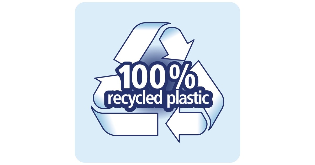 Aus 100% recyceltem Kunststoff, Verpackung aus 80% recyceltem Karton |