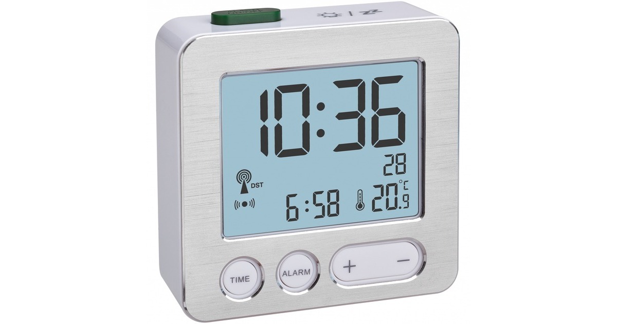 Dieser Funk-Wecker von TFA passt durch sein schlichtes Design in jedes Schlafzimmer. Der Wecker wird über das DCF77 Signal auf die Sekunde genau eingestellt und wechselt automatisch von Sommer- auf Winterzeit. Dazu informiert er immer über das Datum und misst zugleich die aktuelle Raumtemperatur, damit immer für ein gutes Raumklima gesorgt werden kann. Mit dem sekundengenauen Wecker wird man pünktlich zur eingestellten Zeit geweckt und die Schlummerfunktion ermöglicht ein sanfteres Aufwachen. Die Hintergrundbeleuchtung funktioniert per Knopfdruck.Art.-Nr.: 1837077