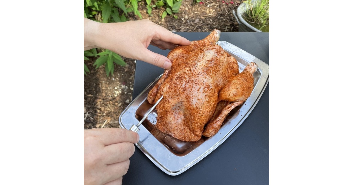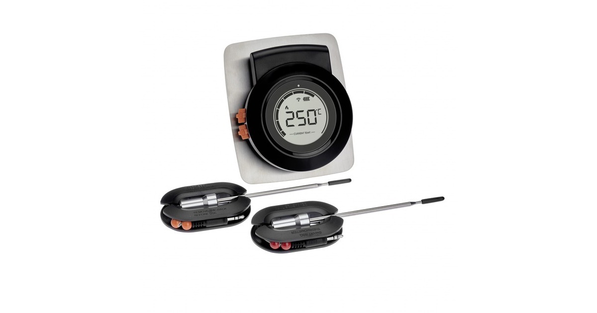 Ob saftiges Pulled Pork, Sparerips oder zarte Schweinelendchen, mit dem Smart Wireless Hyper BBQ Thermometer hat man die volle Kontrolle am Grill. Das Deckelthermometer zeigt beim indirekten Grillen mit geschlossener Haube die Garraumtemperatur auf dem beleuchtbaren Display an. Gleichzeitig können mit den beiden Einstichfühlern die Kerntemperatur von zwei Grillstücken überwacht und auf den Punkt genau im heißen Luftstrom gegart werden. Das Thermometer lässt sich über die Hyper BBQ App mit dem Smartphone oder Tablet verbinden, so kann man die vorprogrammierten Garstufennutzen nutzen oder man kann die Temperaturvorgaben und einen Timer individuell einstellen. Der Garvorgang lässt sich kabellos mit einer Reichweite von bis zu 50 Metern mit dem Mobilgerät verfolgen. Die aktuellen Temperaturen und die Zieltemperaturen werden in der App und abwechselnd auf dem Thermometer-Display angezeigt. Ist die gewünschte Kerntemperatur erreicht, der Timer abgelaufen oder bleibt die Garraumtemperatur nicht innerhalb der einprogrammierten Grenzwerte, hat man die Wahl zwischen verschiedenen Alarmeinstellungen. Die hochwertigen Einstichfühler aus Edelstahl bleiben während des ganzen Garvorgangs im Grill. Sie werden einfach in das Fleisch gesteckt und das hitzebeständige Kabel aus dem Garraum herausgeführt. Zum Aufwickeln des 120 cm langen Kabels wird eine Wickelhilfe mitgeliefert. Das Smart Wireless Hyper BBQ Thermometer kann als Ersatzteil oder auch zum Nachrüsten für einen bestehenden Grill, Smoker, Räucherofen oder Grillwagen verwendet werden. Zur Befestigung an Deckel oder Haube wird ein Lochdurchmesser von circa 9 bis 14mm benötigt. Das Thermometer wird einfach in das vorgebohrte Loch eingesetzt und mit der mitgelieferten Schraubenmutter von innen fixiert. Die mitgelieferte Metallplatte schützt das Gerät vor Überhitzung.Art.-Nr.: 1836967