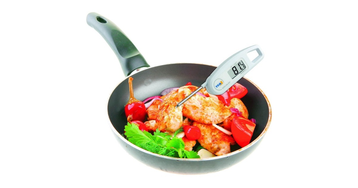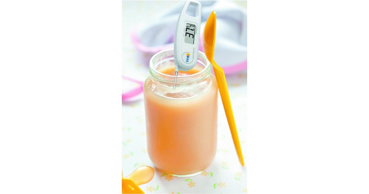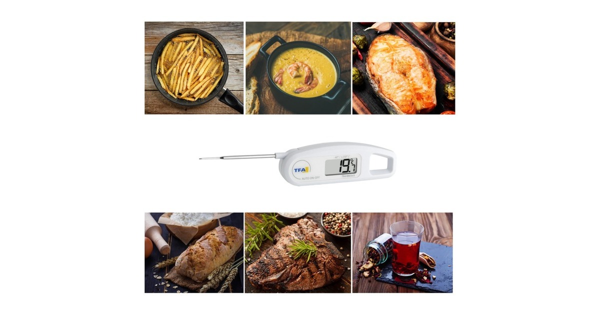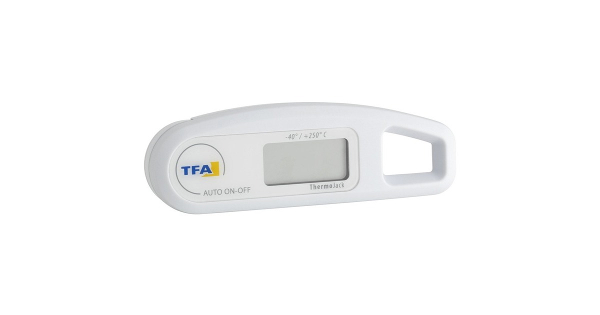 Dieses handliche Klappthermometer von TFA eignet sich ideal für die unkomplizierte Temperaturmessung im Haushalt. Die Kontrolle der Kerntemperatur beim Grillen oder Braten, der sichere Temperatur-Check von Babynahrung oder Badewasser, die temperaturgenaue Zubereitung von Leckereien aus Zucker und Schokolade, das Einkochen von Marmelade und die Überprüfung der Trinktemperatur von Wein und Getränken, das ist der Einsatzbereich von Thermo Jack. Vor allem Nahrungsmittel jeglicher Art können mit dem handlichen Thermometer schnell, exakt und mühelos gemessen werden. Der praktische Klappmechanismus macht es einfach zu bedienen. Den Fühler ausklappen, einstechen und binnen kürzester Zeit liefert das Gerät die exakte Temperatur. Nach Gebrauch einfach wieder zuklappen, schon ist es ausgeschaltet und wartet gut verstaut in der Hosentasche auf den nächsten Einsatz. Dank seiner speziell geformten Messspitze misst das Thermo Jack die Temperatur präzise in nur 7 Sekunden. Das Gerät ist strahlwassergeschützt und kann nach Gebrauch unter fließendem Wasser gereinigt werden.