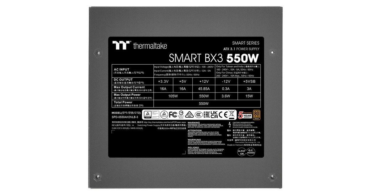 Das PC-Netzteil Thermaltake SMART BX3 550W unterstützt den ATX 3.1 Standard und Intel Deep Power Down C6/C7 Status. Das SMART BX3 550W besitzt einen Wirkungsgrad von bis zu 85% und ist 80 PLUS Bronze zertifiziert. Das Netzteil besitzt schwarze flache Low Profile-Kabel und wurde mit hochqualitativen Kondensatoren gefertigt. Art.-Nr.: 100045664