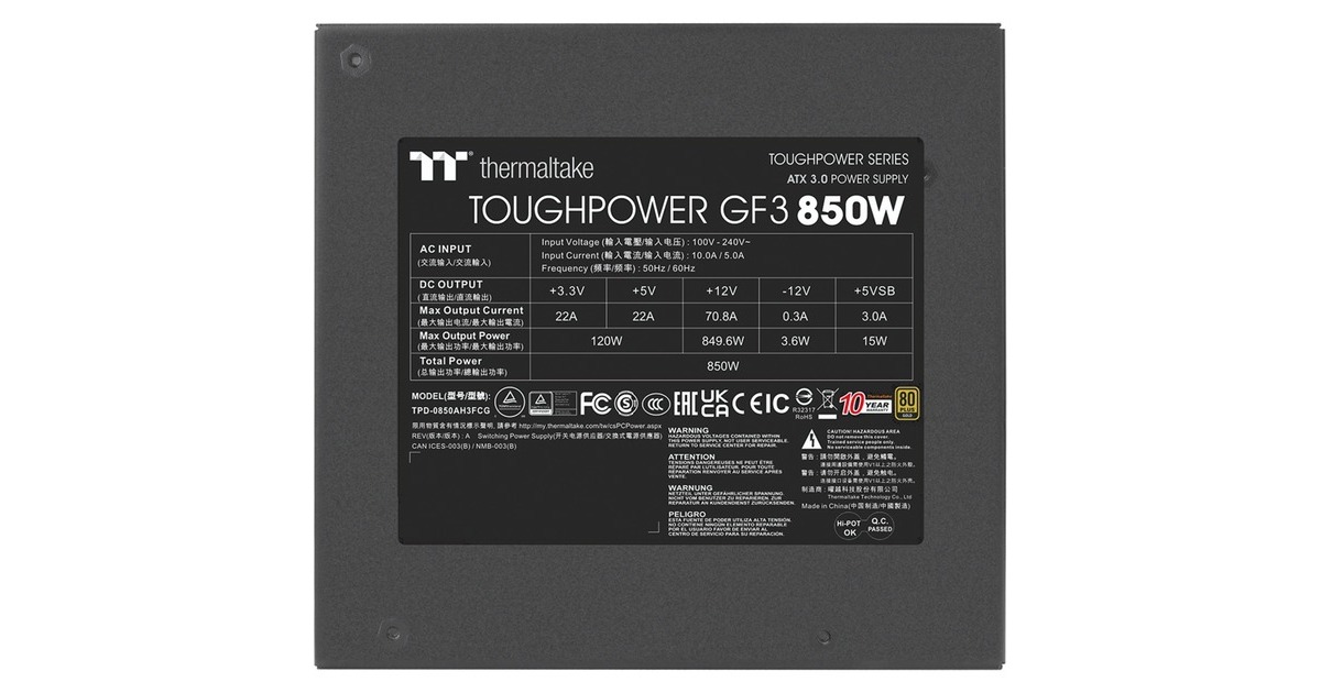 Das Thermaltake Toughpower GF3 850W ist PCIe Gen 5-konform, 80 PLUS Gold-zertifiziert mit einer Effizienz von bis zu 90 % und besitzt einen 140-mm-Lüfter mit Hydraulic-Lager. Die Japanische 105°C-Kondensatoren bieten 100% Premium-Qualität. Die vollständig modularen, flachen schwarze Kabel haben ein niedriges Profil. Der Smart Zero Fan minimiert unerwünschte Geräusche. Das Hochstromdesign mit einer einzigen +12V-Schiene und das DC-DC-Design sorgen für eine präzisere elektrische Leistung.Art.-Nr.: 1844780