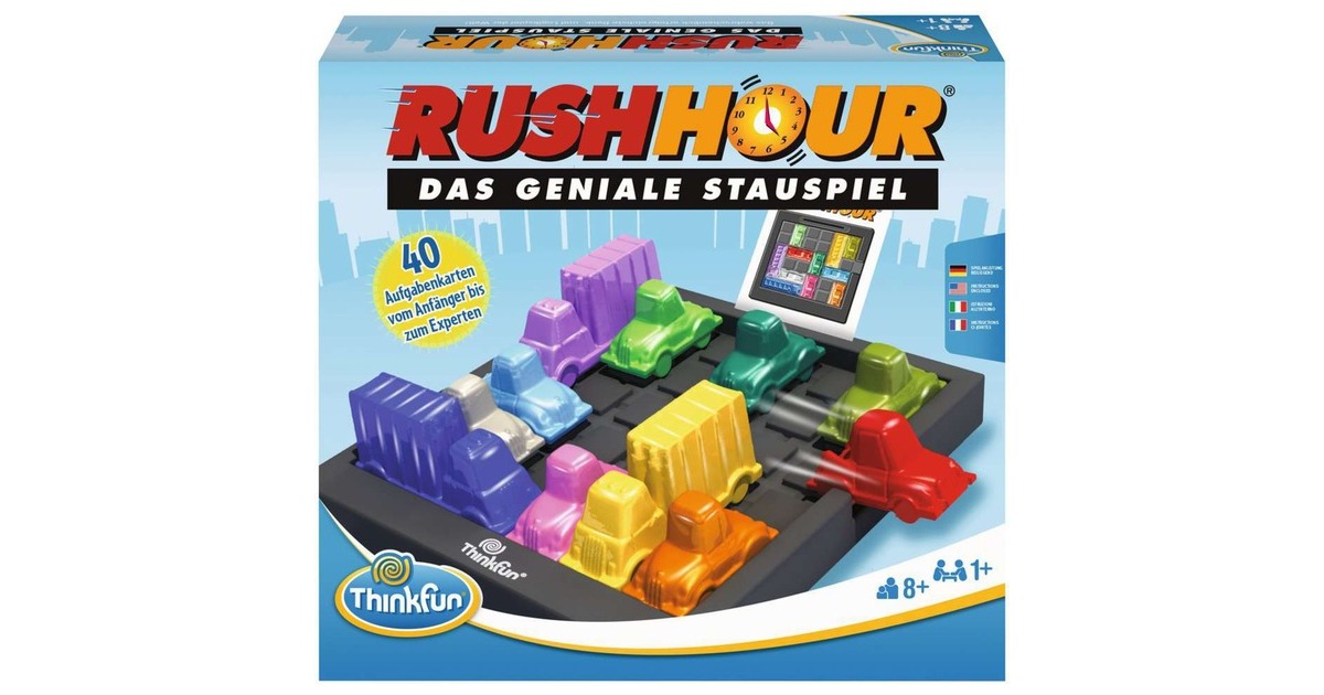 Tuuut, tut – Platz da bitte! Bei Rush Hour manövriert der Spieler das rote Auto geschickt durch einen Stau zur Ausfahrt, indem er andere Fahrzeuge clever aus dem Weg schiebt. 40 Aufgabenkarten in vier Schwierigkeitsstufen geben die Ausgangspositionen des roten Autos und der anderen Fahrzeuge vor. Jede Karte ist eine neue Herausforderung, denn die Aufgaben werden immer schwieriger – aber immer nur so viel, dass der Spieler sie mit etwas Überlegen lösen kann. Turbogang einlegen und los geht’s! Dank des praktischen Mitnahmebeutels auch ideal für unterwegs geeignet. Fördert logisches und lösungsorientiertes Denken.Art.-Nr.: 1744709