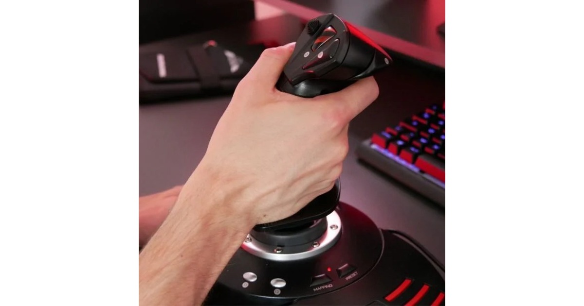 Der Joystick besitzt zwei bereits vorgegebene Konfigurationen: für PC - Flight Simulator X und für PS3 - Blazing Angels. Konfiguriert: Drossel, Flaps, Ruder, Fahrwerk, Trimmung und Kamera/Sicht. |