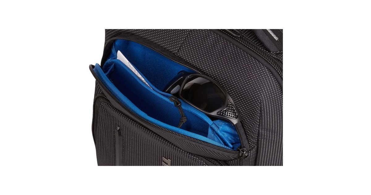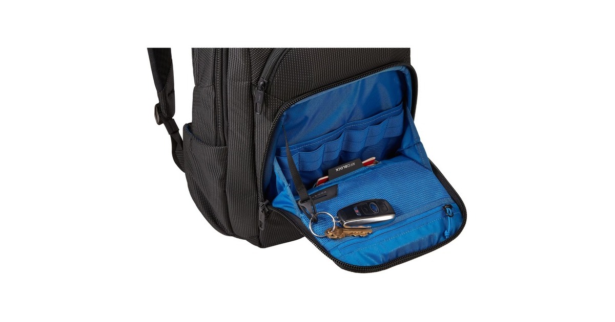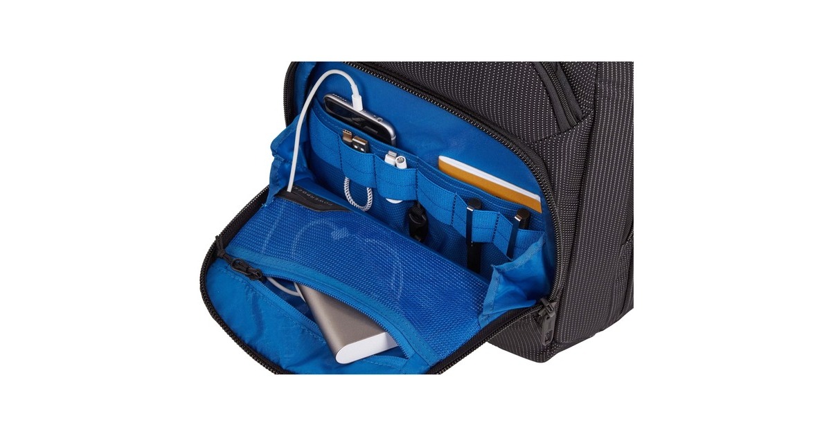 Utensilienfach, Trinkflaschenhalter, RFID Schutzfach, leicht zugängliches und druckbeständiges "SafeZone"-Fach, Organisationsmöglichkeit für Kleinteile mit der Einschubtasche an der Vorderseite, elastischen Schlaufen, in der Netztasche mit Reißverschluss und mit dem Kabelmanagementsystem, separate Aufbewahrungshülle mit weichem Innenfutter für ein Tablet, verstärkte Seitentaschen |