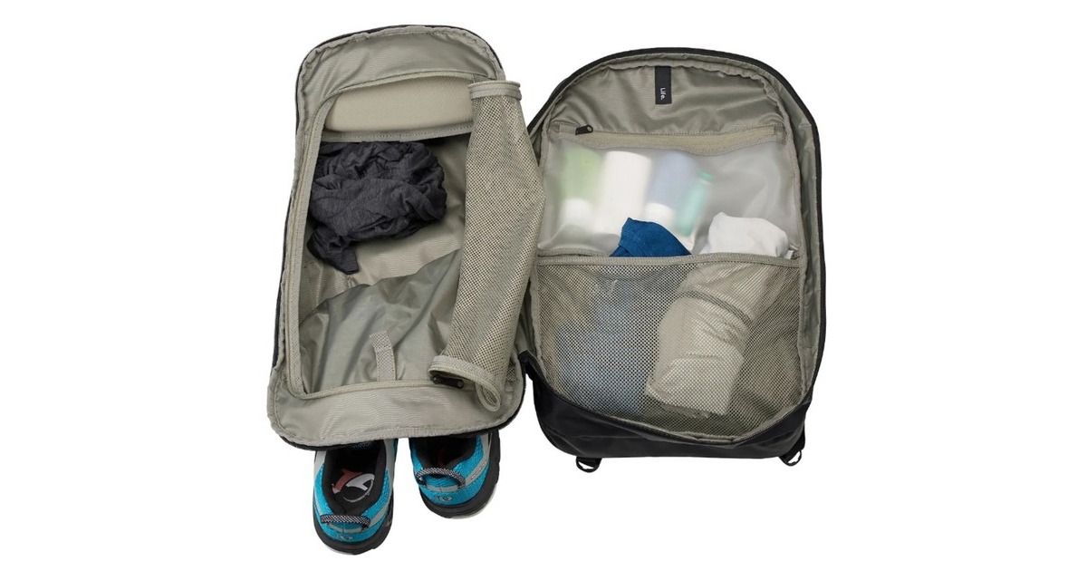 Frontfach, Utensilienfach, Trinkflaschenhalter, separate Fächer zur Aufbewahrung von Elektronik, Arbeitsutensilien und persönlichen Gegenständen, Netztasche ist von außen zugänglich, so dass schmutzige von sauberen Gegenständen getrennt werden können, starre SafeZone-Tasche schützt ein Telefon, eine Sonnenbrille oder andere Wertsachen, zwei blickdichte und wasserfeste TPU-Innentaschen mit Reißverschluss, Rucksack lässt sich für leichtes Packen vollständig öffnen, seitliche Netztaschen |