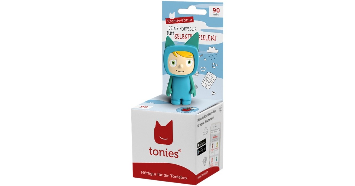Bei Kreativ-Tonies handelt es sich um Spielfiguren, die gleichzeitig als Hörfigur dienen. Sie werden magnetisch auf die Toniebox gelegt und spielen eigene, aufgenommene Hörabenteuer ab. Um die Aufnahme-Funktion zu nutzen, ist ein kostenfreies Toniecloud-Kundenkonto erforderlich. |