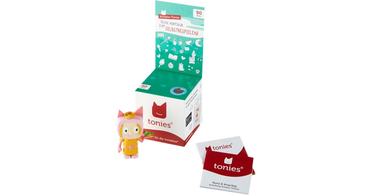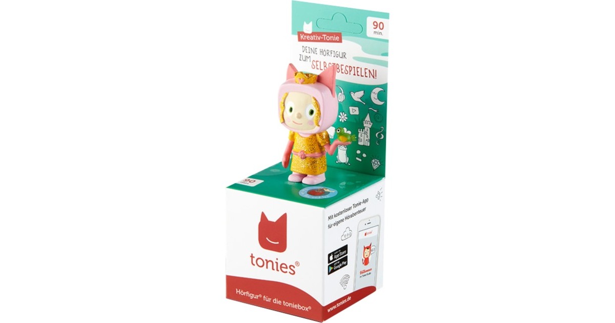 Bei Kreativ-Tonies handelt es sich um Spielfiguren, die gleichzeitig als Hörfigur dienen. Sie werden magnetisch auf die Toniebox gelegt und spielen eigene, aufgenommene Hörabenteuer ab. Um die Aufnahme-Funktion zu nutzen, ist ein kostenfreies Toniecloud-Kundenkonto erforderlich. |