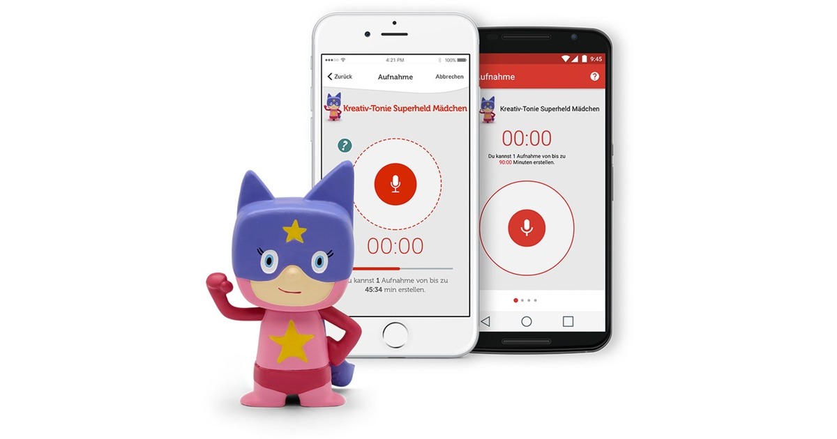 Bei Kreativ-Tonies handelt es sich um Spielfiguren, die gleichzeitig als Hörfigur dienen. Sie werden magnetisch auf die Toniebox gelegt und spielen eigene, aufgenommene Hörabenteuer ab. Um die Aufnahme-Funktion zu nutzen, ist ein kostenfreies Toniecloud-Kundenkonto erforderlich. |
