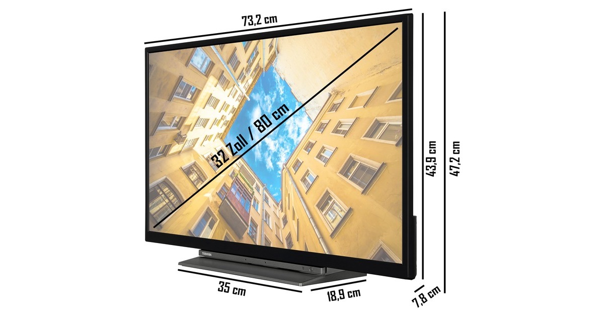 Der Toshiba 32WK3C63DAY bietet nahezu unbegrenztes Entertainment, denn neben dem Empfang von Fernseh- oder Radiosignalen kann man mit den zahlreichen SmartTV Funktionen auf verschiedene Portale und Dienste zurückgreifen. Das 80 cm (32") große Panel stellt realistische sowie faszinierende Farben dar und löst mit WXGA (1.366 x 768 Pixel) auf - so ist es für hochauflösende Inhalte gerüstet und erzeugt ein detailliertes Bild mit tollen Farben und mehr Schärfe. Weiterhin steht ein Triple Tuner zur Verfügung, um Satelliten-, Kabel- oder terrestrische Signale zu Empfangen und zu Verarbeiten - dank automatischer Sendersuche und zahlreichen Möglichkeiten zur Personalisierung schnell und unkompliziert. Darüber hinaus kann der 32WK3C63DAY als SmartTV auf zahlreiche Online-Funktionen zugreifen, die das übliche TV-Erlebnis erweitern. Ob Streaming-Dienste, Mediatheken unterschiedlicher Anbieter oder Anwendungen und Suchfunktionen über das Internet, hier ist für jeden Geschmack etwas dabei. Zusätzliche Lautsprecher sind nicht erforderlich, die bringt der 32WK3C63DAY gleich mit: Die 12 Watt starken Stereo Lautsprecher mit Dolby Audio machen jeden Inhalt noch mitreißender und authentischer.Art.-Nr.: 1839711