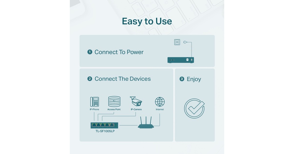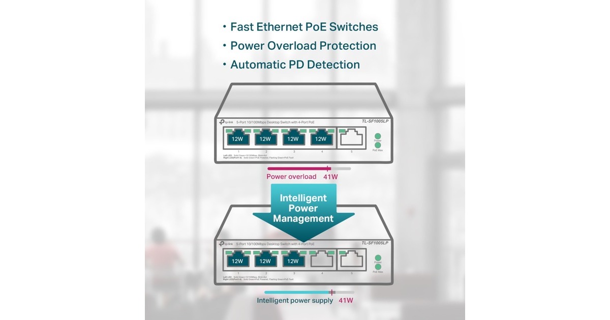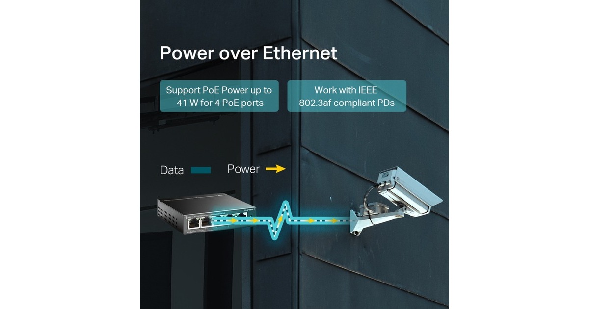 Die Einhaltung des 802.3af PoE-Standards unterstützt bis zu 15,4 W an jedem PoE-Port. Das gesamte 41-W-PoE-Leistungsbudget für die 4 × PoE-Ports eröffnet eine breite Palette von Anwendungen, z. B. die Überwachung von Büros, Schlafsälen und kleinen Unternehmen. Es ist voll kompatibel mit IP-Kameras, Access Points, IP-Telefonen, Computern, Druckern und mehr.