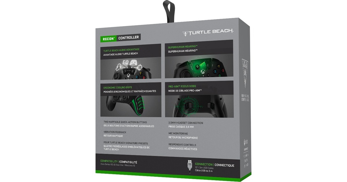 Der Turtle Beach Recon Controller für Xbox Series X|S und Xbox One bringt revolutionären Sound und unschlagbare Steuerung zusammen. Einfach ein Headset mit 3,5-mm-Stecker anschließen und sofort die bewährten Audiovorteile von Turtle Beach genießen, wie Superhuman Hearing, Mikrofon-Monitoring, die bekannten Audio-Voreinstellungen und vieles mehr. Das bietet kein anderer Controller. Der Pro-Aim-Focus-Modus ist die Geheimwaffe, um der Konkurrenz einen Schritt voraus zu sein, denn damit lässt sich die Empfindlichkeit des Ministicks noch besser auf große Distanzen einstellen. Einstellungen lassen sich in bis zu vier Profilen speichern, die man über die beiden Quick-Action-Tasten an der Rückseite abrufen kann. Zwei Motoren in Griff und Triggern sorgen für das Vibrationsfeedback der nächsten Generation. So spürt man den Rückstoß beim Schießen und das Brummen des Motors. Dank seiner ergonomischen Form und der kühlenden Griffe kann man mit dem Recon Controller zudem länger spielen und die Hände bleiben dabei stets cool.Art.-Nr.: 1748740