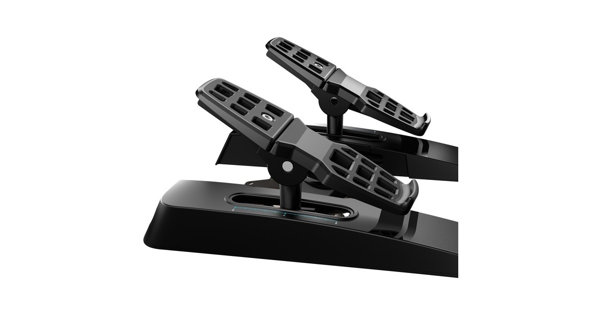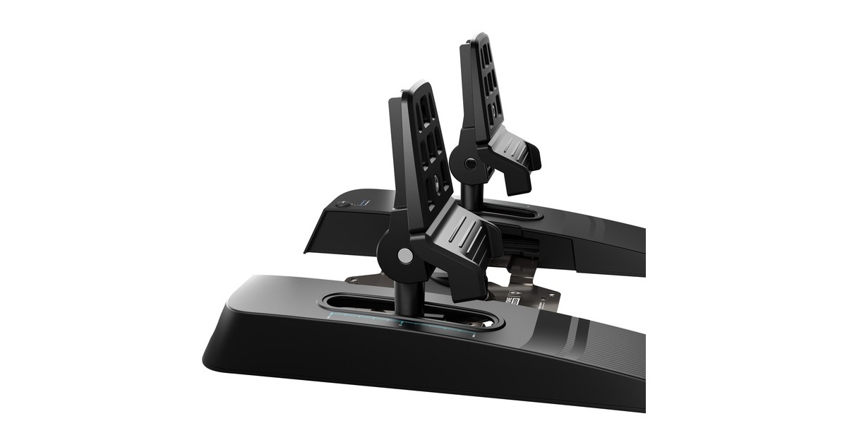 Stufenlose Seitenruder-Achse mit austauschbaren Federn, Differenzialbremsen, einstellbare Pedalbreite, 2 Sätze austauschbare Pedale, kontaktlose Hall-Effekt-Sensoren für hochauflösende 10-Bit-Achsendaten auf allen Achsen, stabiler rutschfreier Sockel, Modus-Taste |