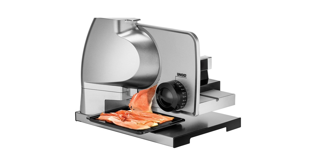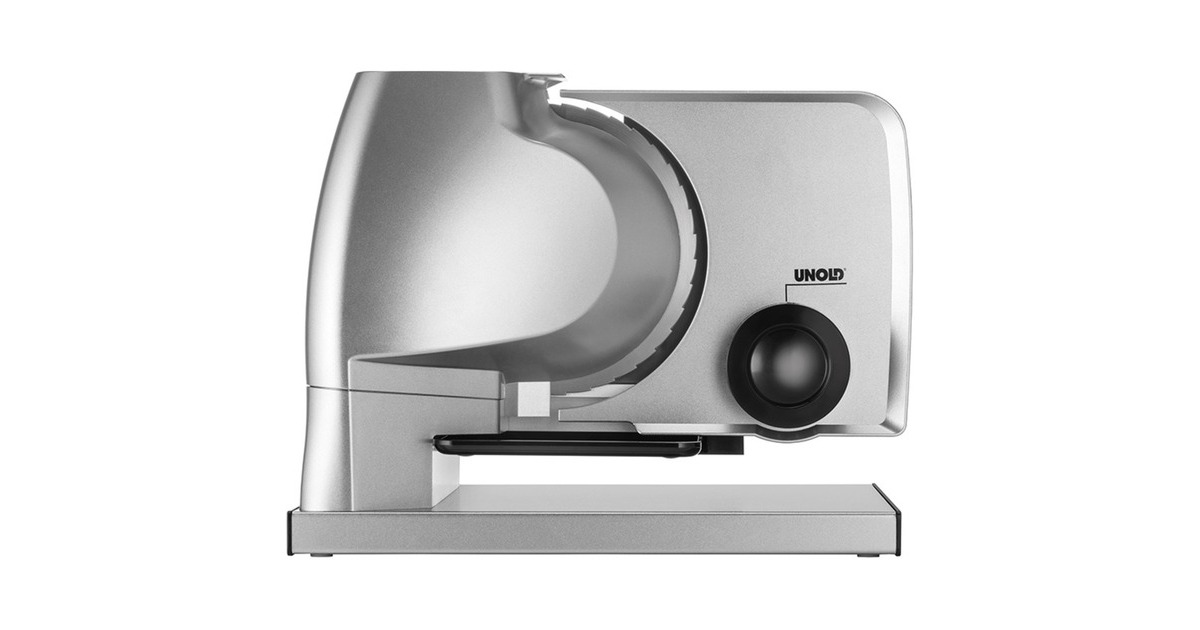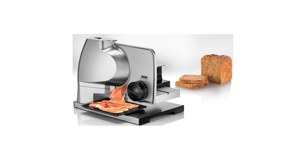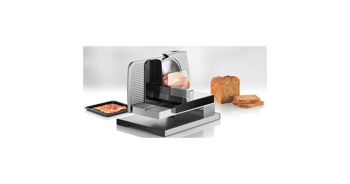 In stylishem Metall-Outfit mit schwarzen Kunststoff-Elementen präsentiert sich der Allesschneider Metall Plus 78826. Mit dem Metall-Allesschneider kann Brot, Wurst, Käse, Obst und Gemüse in gleichmäßige Scheiben geschnitten werden. Die freischwebende Konstruktion macht ihn zu einem Hingucker, in dem die Auffangschale platzsparend untergebracht werden kann, wenn sie nicht benötigt wird. Auf Antirutschfüßen hat der Allesschneider Metall Plus sicheren Stand und der abnehmbare Resthalter mit Fingerschutz sorgt für optimale Schnittergebnisse! Das entnehmbare Edelstahl-Wellenschliffmesser mit 17 cm Durchmesser wird mühelos mit jedem Schneidgut fertig – ob frisches Brot oder leckere Salami, aromatischer Käse oder die Gemüse. Die Schnittbreite der Scheiben lässt sich stufenlos bis zu circa 23 mm einstellen. Mit dem Moment- und Dauerschalter hat man die Wahl, sollen nur ein paar Scheibchen geschnitten werden oder größere Mengen, der 100 Watt starke Motor kann beides. Wird der Metall Plus 78826 nicht benutzt können das Kabel und die Auffangschale einfach im Gerät verstaut werden.Art.-Nr.: 1632856