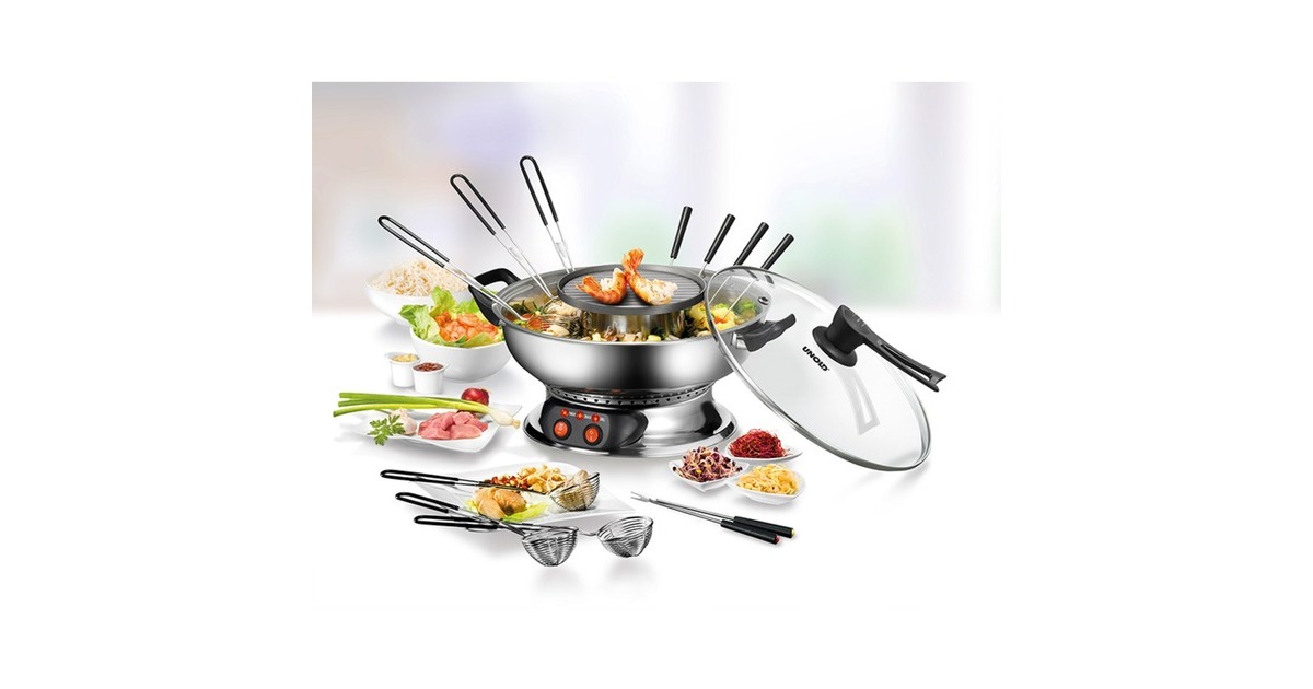 Das Unold Asia-Fondue 48746 bietet eine Doppelfunktion: Während auf der Grillplatte Gambas oder kleine Steaks zubereitet werden, garen in aromatischer Gemüsebrühe Brokkoliröschen, Seeteufel-Filets oder Hähnchenbrust-Stücke. Weil Fondue- und Grillfunktion getrennt schaltbar sind, kann natürlich auch mal ein reines Fondue stattfinden – dafür stehen zwei Temperaturstufen (bis zu 1.950 Watt) zur Verfügung. Der großzügige Fonduetopf ist aus hochwertigem Edelstahl gefertigt. Ein schicker Glasdeckel gehört auch dazu. Wenn mal eine Essenspause eingelegt werden soll, ganz einfach den Deckel auflegen und die Temperatur runterschalten. Zur bequemen Reinigung ist das Asia-Fondue 48746 komplett zerlegbar, außerdem sind alle nicht-elektrischen Teile spülmaschinengeeignet. Das Zubehör ist auf alle kulinarischen Anforderungen eingestellt: Sechs Körbchen, mit denen man zum Beispiel Gemüsestücke oder in Teig gewälzte Champignonköpfe immer sicher im Griff hat, und sechs farbig markierte Gabeln für Fleisch- oder Fischstücke sind ebenso serienmäßig wie die Bedienungsanleitung mit inspirierenden Rezepten.Art.-Nr.: 1884610