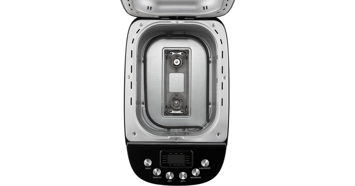 Hell, mittel oder dunkel, der Backmeister Big Black bietet den gewünschten Brot-Bräunungsgrad und die Größen 1.000, 1.250 oder 1.500g Brotgewicht. 15 gespeicherte Programme setzen auf hausgemachte Vielfalt u.a. für glutenfreies Brot, Marmelade / Konfitüre, Kuchen, Nudelteig oder Joghurt. Der leistungsstarke, robuste AC-Motor vermengt in der entnehmbaren Backform mit ihrem antihaftbeschichteten Doppelkneter alles gut. Durch zwei große Sichtfenster kann der Fortschritt immer beobachtet werden. Mit der Zeitwahltaste wird der Start bis zu 15 Stunden vorprogrammiert, und bei Stromausfall gibt es die Netzausfallsicherung für circa 15 Minuten, dann kann es mit dem gewählten Programm weitergehen. Auf dem benutzerfreundlichen, beleuchteten LCD-Display können Brotgröße und Bräunungsgrad festgelegt werden. Auch bei schwerem Brotteig sorgen die Antirutschfüße vom Backmeister Big Black für sicheren Stand. Zum Lieferumfang gehören Messbecher und -löffel, 2 Kneter, 1 Hakenspieß und eine Bedienungsanleitung mit vielerlei Rezepten.Art.-Nr.: 1734884