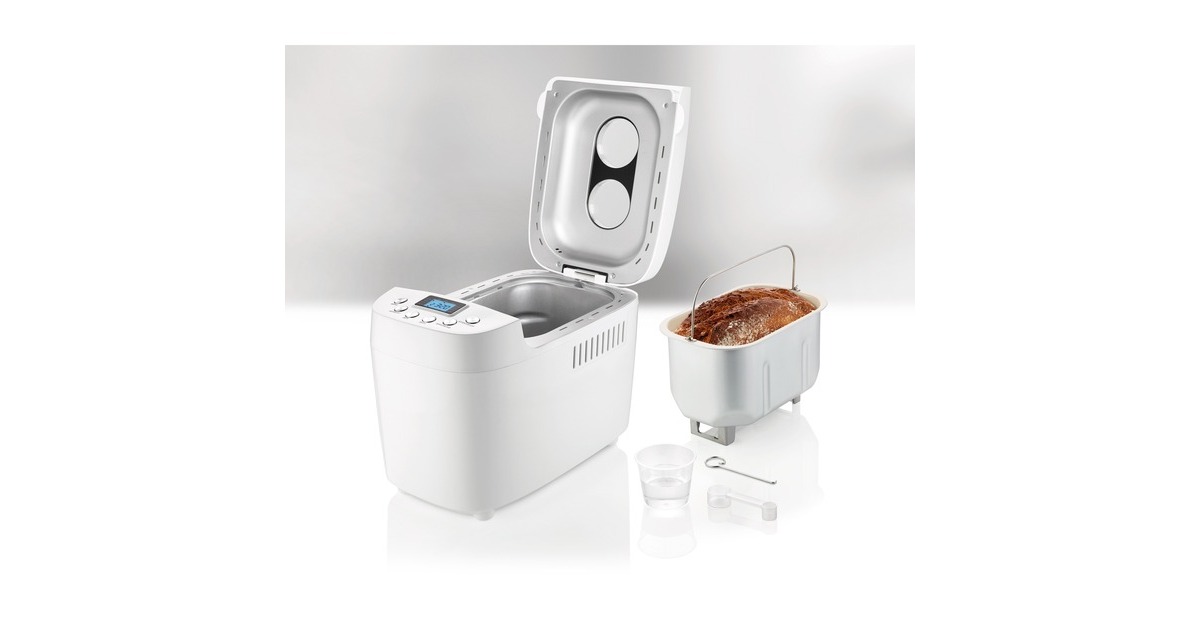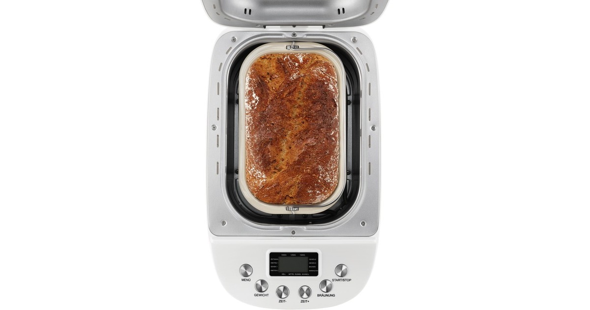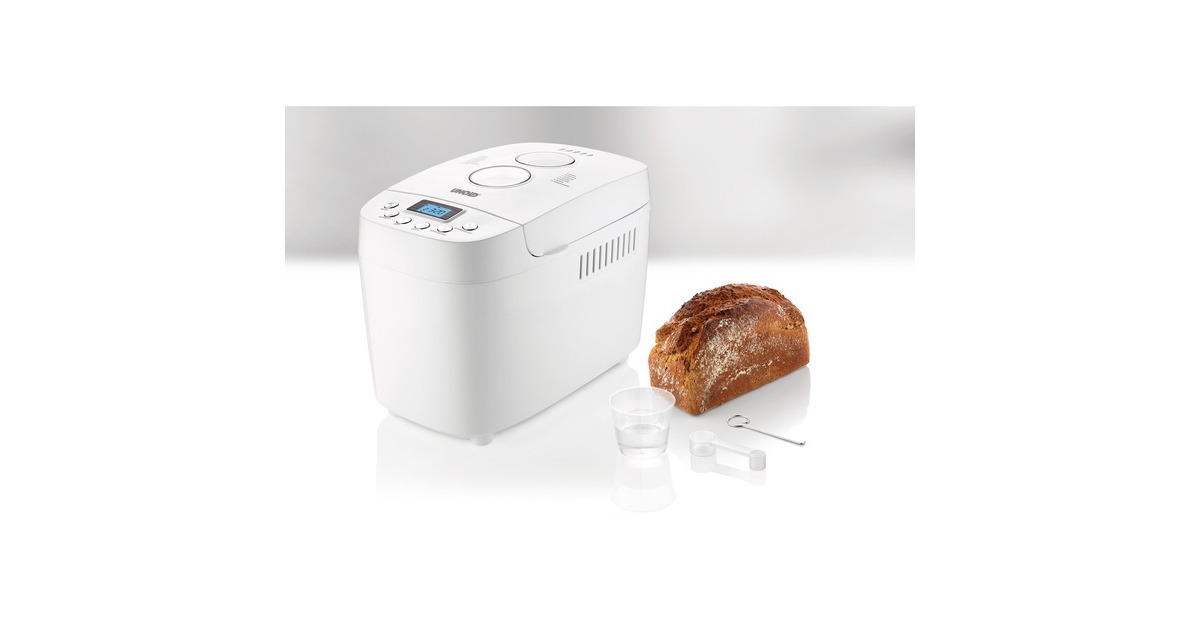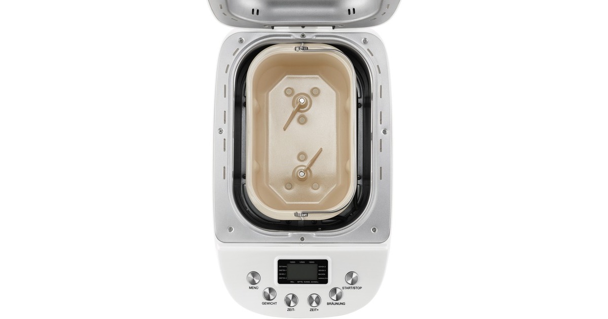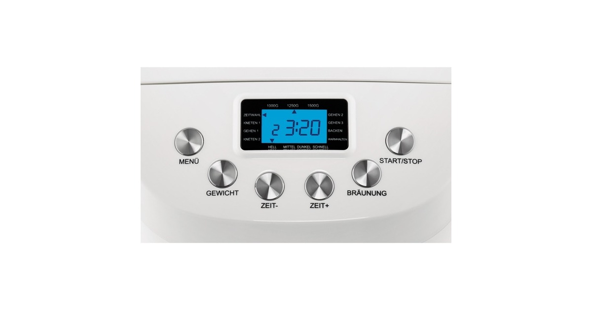 Hell, mittel oder dunkel, der Backmeister Big White bietet den gewünschten Brot-Bräunungsgrad und die Größen 1.000, 1.250 oder 1.500g Brotgewicht. 15 gespeicherte Programme setzen auf hausgemachte Vielfalt u.a. für glutenfreies Brot, Marmelade / Konfitüre, Kuchen, Nudelteig oder Joghurt. Der leistungsstarke, robuste AC-Motor vermengt in der entnehmbaren Backform mit ihrem antihaftbeschichteten Doppelkneter alles gut. Durch zwei große Sichtfenster kann der Fortschritt immer beobachtet werden. Mit der Zeitwahltaste wird der Start bis zu 15 Stunden vorprogrammiert, und bei Stromausfall gibt es die Netzausfallsicherung für circa 15 Minuten, dann kann es mit dem gewählten Programm weitergehen. Auf dem benutzerfreundlichen, beleuchteten LCD-Display können Brotgröße und Bräunungsgrad festgelegt werden. Auch bei schwerem Brotteig sorgen die Antirutschfüße vom Backmeister Big White für sicheren Stand. Zum Lieferumfang gehören Messbecher und -löffel, 2 Kneter, 1 Hakenspieß und eine Bedienungsanleitung mit vielerlei Rezepten.Art.-Nr.: 1734876