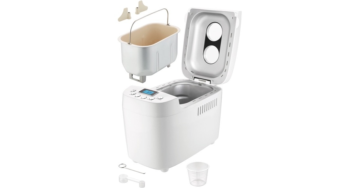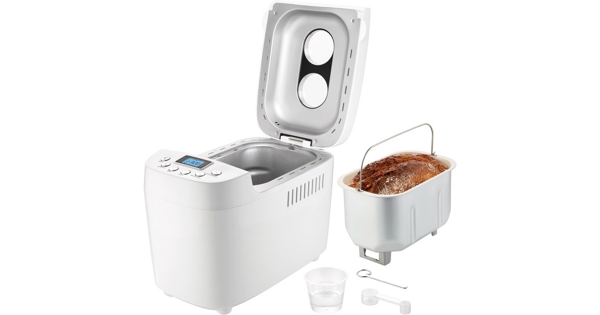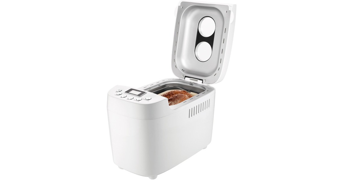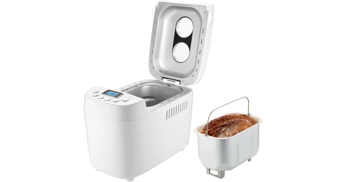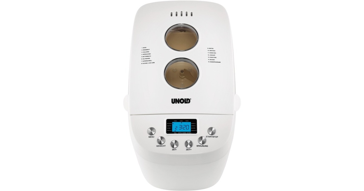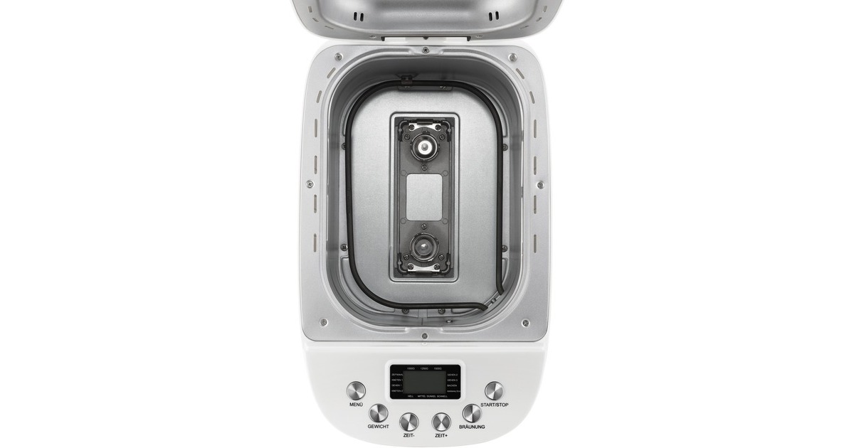 Hell, mittel oder dunkel, der Backmeister Big White bietet den gewünschten Brot-Bräunungsgrad und die Größen 1.000, 1.250 oder 1.500g Brotgewicht. 15 gespeicherte Programme setzen auf hausgemachte Vielfalt u.a. für glutenfreies Brot, Marmelade / Konfitüre, Kuchen, Nudelteig oder Joghurt. Der leistungsstarke, robuste AC-Motor vermengt in der entnehmbaren Backform mit ihrem antihaftbeschichteten Doppelkneter alles gut. Durch zwei große Sichtfenster kann der Fortschritt immer beobachtet werden. Mit der Zeitwahltaste wird der Start bis zu 15 Stunden vorprogrammiert, und bei Stromausfall gibt es die Netzausfallsicherung für circa 15 Minuten, dann kann es mit dem gewählten Programm weitergehen. Auf dem benutzerfreundlichen, beleuchteten LCD-Display können Brotgröße und Bräunungsgrad festgelegt werden. Auch bei schwerem Brotteig sorgen die Antirutschfüße vom Backmeister Big White für sicheren Stand. Zum Lieferumfang gehören Messbecher und -löffel, 2 Kneter, 1 Hakenspieß und eine Bedienungsanleitung mit vielerlei Rezepten.Art.-Nr.: 1734876