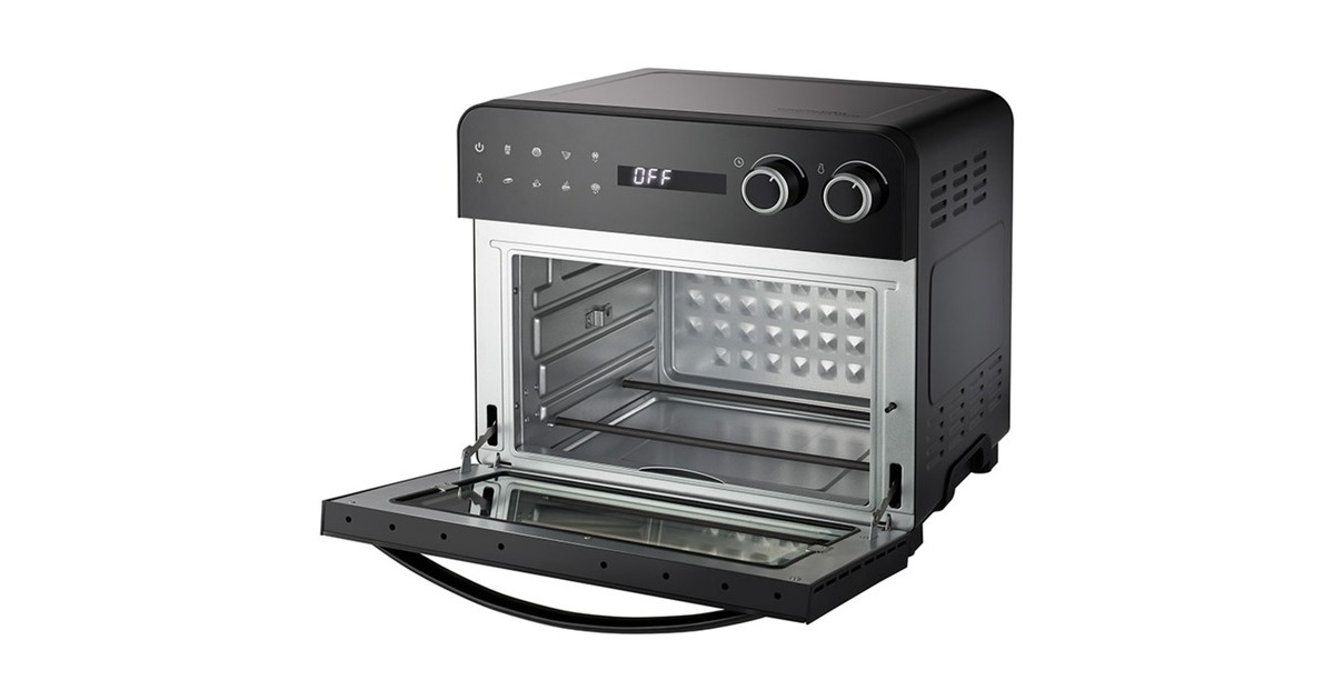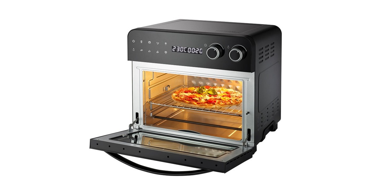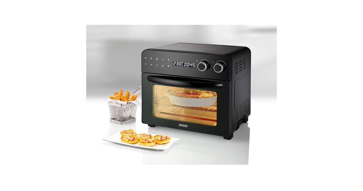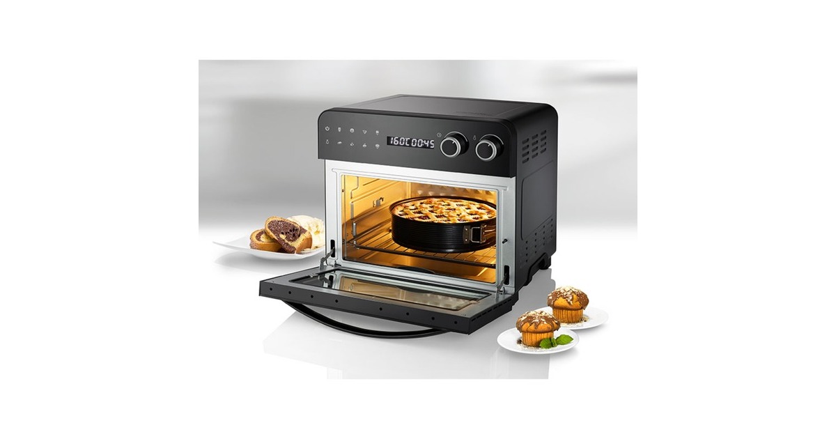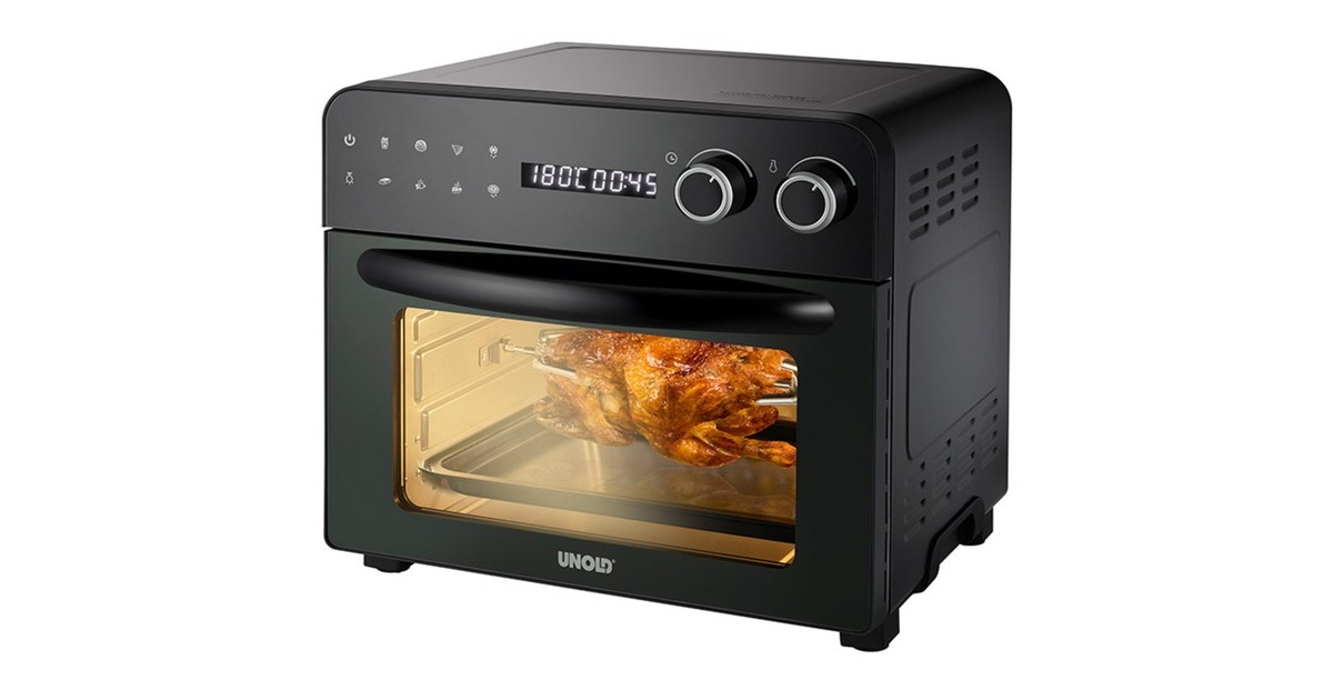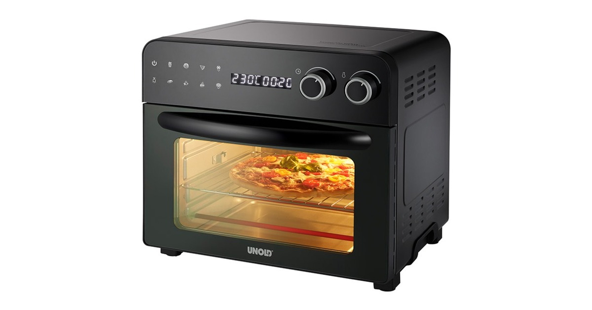 Mit dem Multifunktionsofen Diamant bereichert ein kulinarisches Multitalent jede Küche! Der kompakte Küchenassistent mit seinen 3 Garebenen hat 8 Automatikprogramme zu bieten: Pizza, Pommes Frites, Brot, Drehspieß, Steak, Kuchen, Aufwärmen und Dörren. 6 Edelstahl-Heizelemente sorgen für die perfekte Temperatur zwischen 40 und 230°C – und die diamantförmige Rückwand sorgt dabei für eine bessere Luftzirkulation. Im großzügigen Backraum finden auch Pizzen bis ca. 26 cm Durchmesser Platz. Das Außengehäuse energiesparend hitzeisoliert. Auf dem großen, digitalen Touchscreen-Bedienfeld kann das gewünschte Programm und ein Timer für 1 bis 5 Stunden ausgewählt werden. Das LED-Display informiert über Temperatur und Zeit. Durch das große Sichtfenster aus Glas und die Innenbeleuchtung hat man den Garvorgang immer bestens im Blick. Ein akustisches Fertigsignal sorgt dafür, dass nichts anbrennt. Das spülmaschinengeeignete Zubehör lässt keine Wünsche offen: Neben Grillrost und Grillrostheber gibt es ein Backblech, einen Frittierkorb, einen Drehspieß mit Halteklammern – und inspirierende Rezepte sind in die aussagekräftige Bedienungsanleitung integriert.